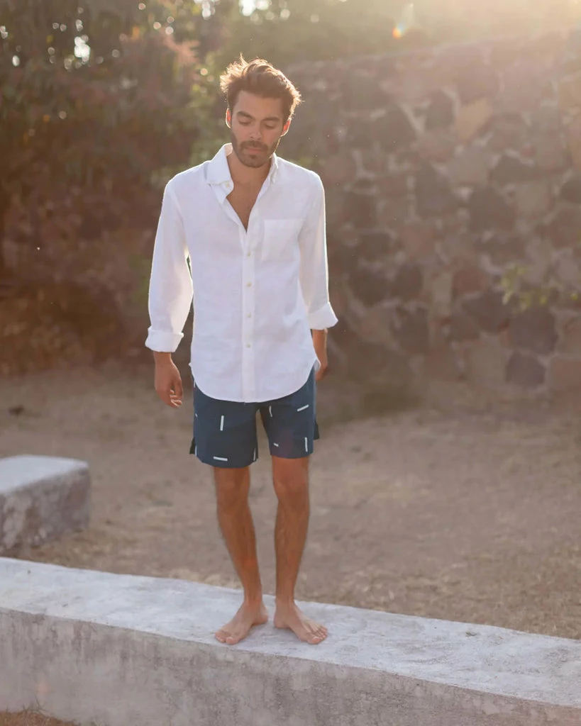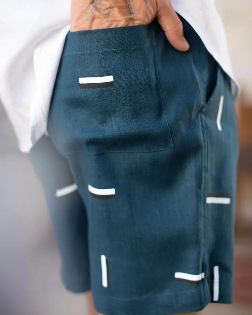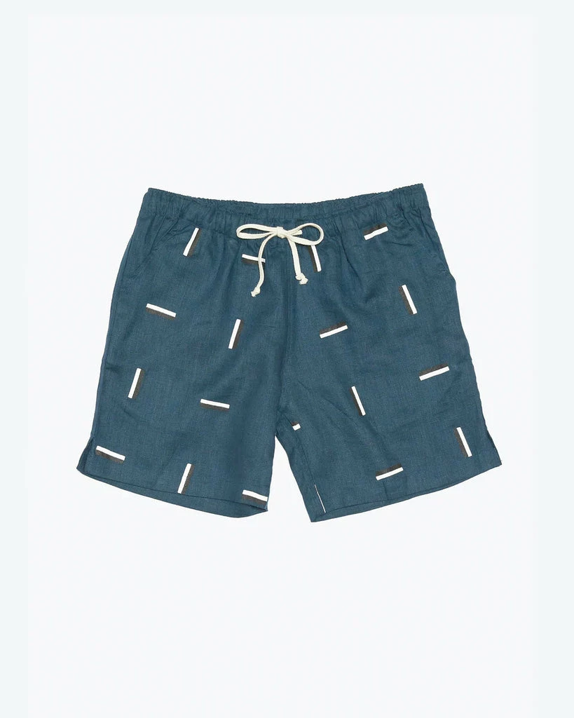 Alex Crane dusk “Bo” short with screen printed short lines in black and white is a drawstring elastic waist short made of natural washed European linen. Slimmer more modern fit. If you have an athletic physique, size up one from your normal size. Made in India.