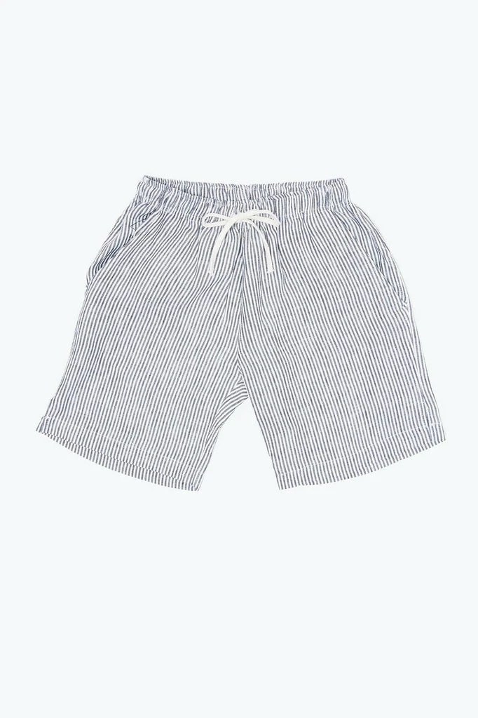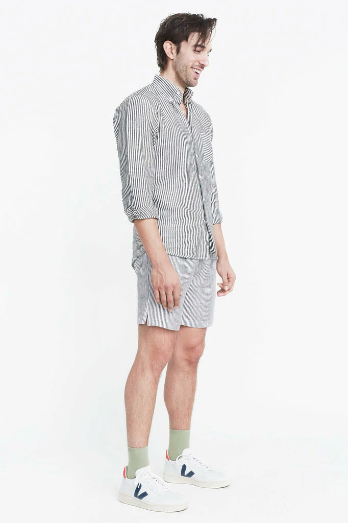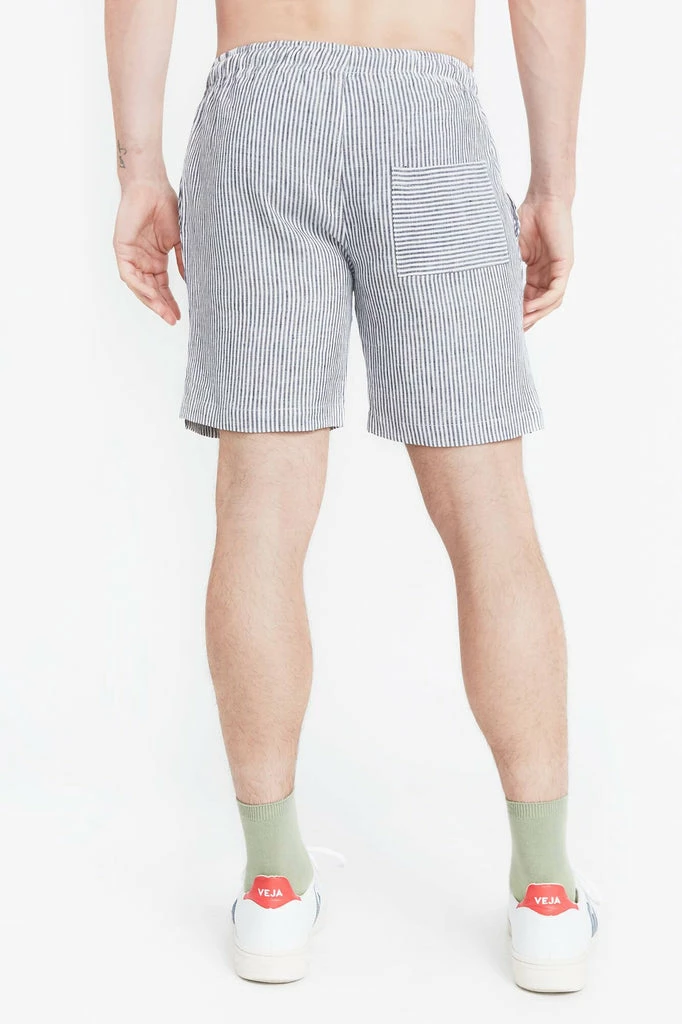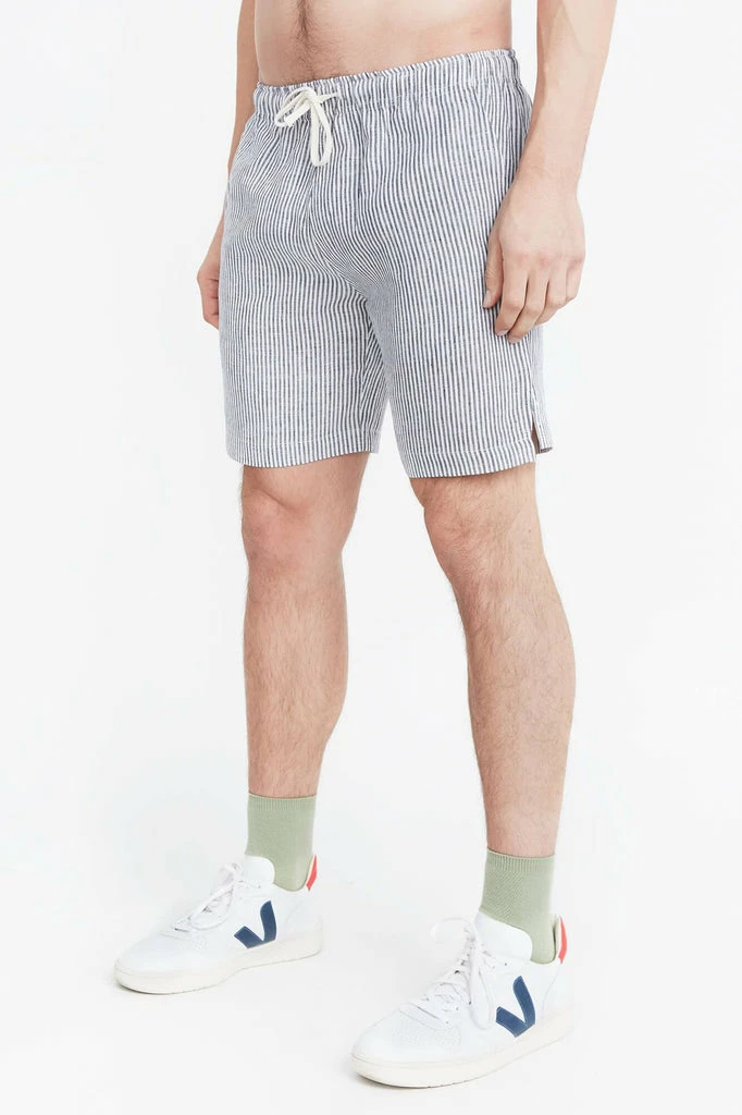 Alex Crane lines navy and white “Bo” short is a drawstring elastic waist short made of natural washed European linen. Slimmer more modern fit. If you have an athletic physique, size up one from your normal size. Made in India. Available in sizes Small through X-Large.