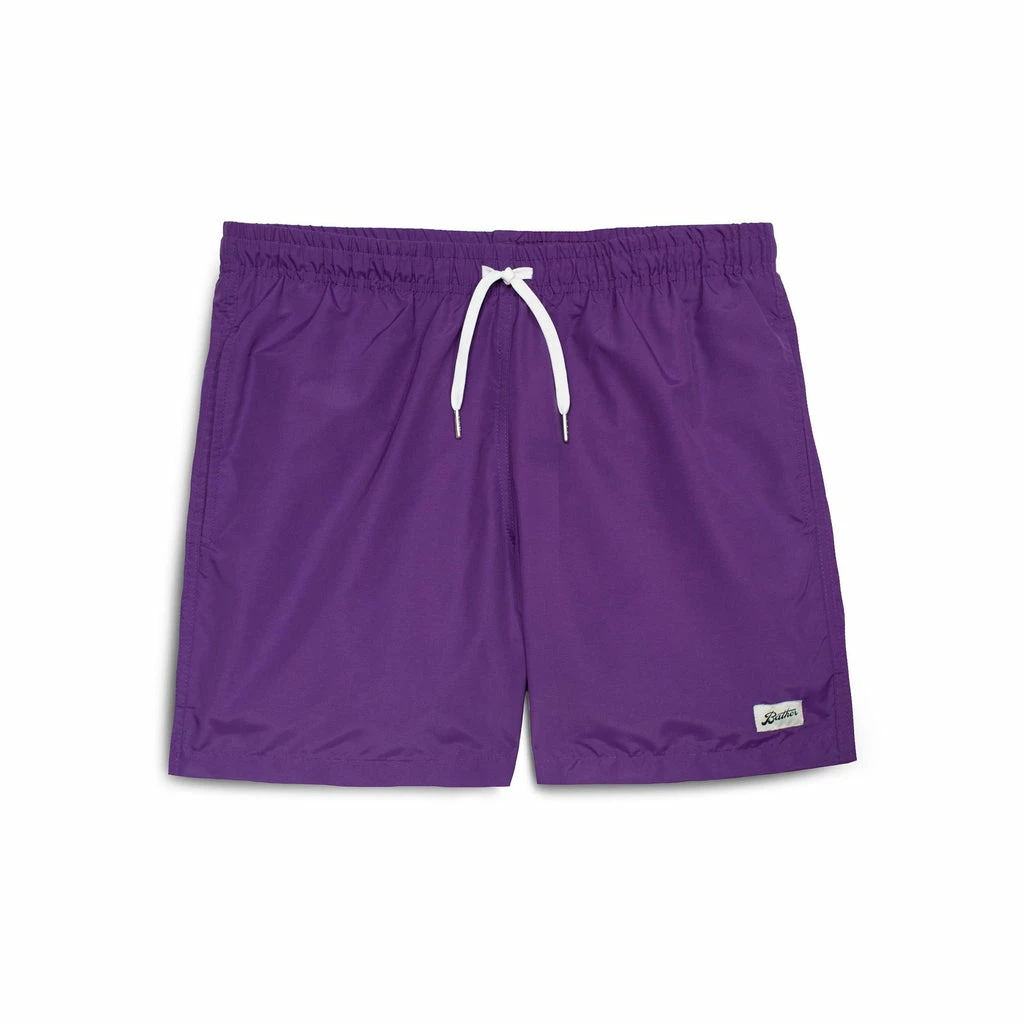 Classic swim trunk in purple. Elasticized waist with an ultra fine four-way stretch mesh lining. Quick drying 100% nylon shell, 90% nulon 10% spandex ultra fine mesh lining with reinforced pockets, back pocket with snap closure. 5.5″ inseam. Made in Canada from recycled post-consumer PET plastic bottles.Â