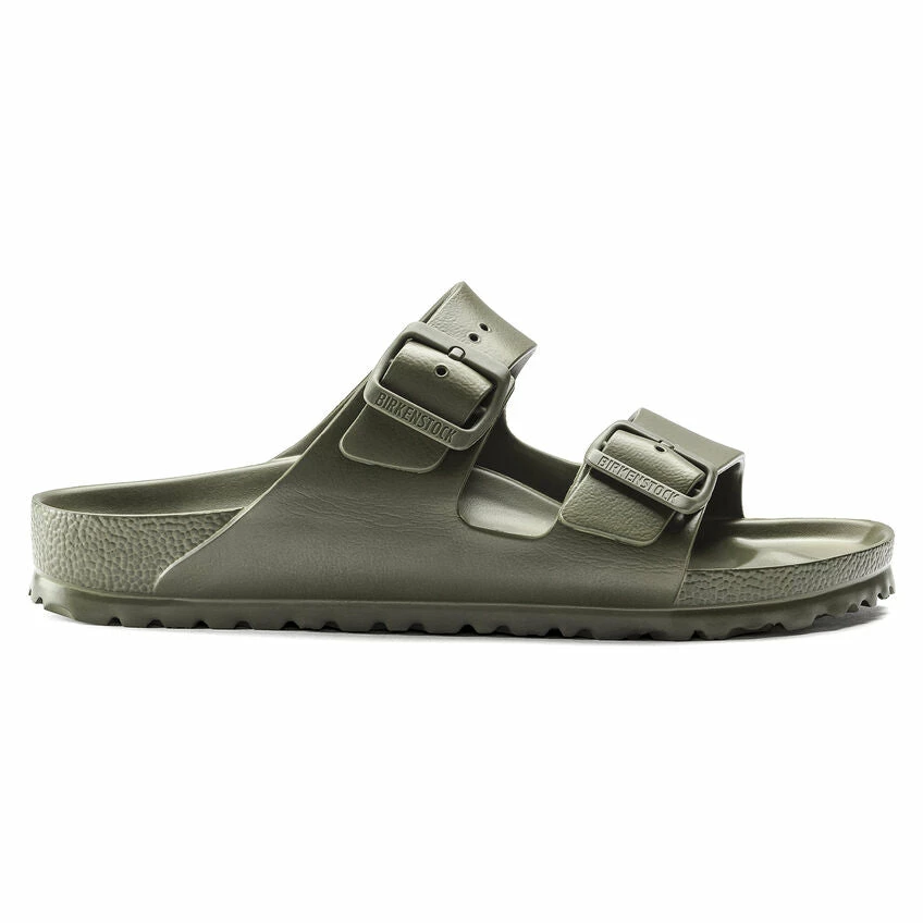 Birkenstock khaki green EVA Arizona two strap design sandal. Modeled on the cork original, made from ultra lightweight and highly flexible EVA. These sandals are shock absorbing, waterproof, and skin-friendly. Wear them at the beach, in the garden, or around the gym and after workouts.Â