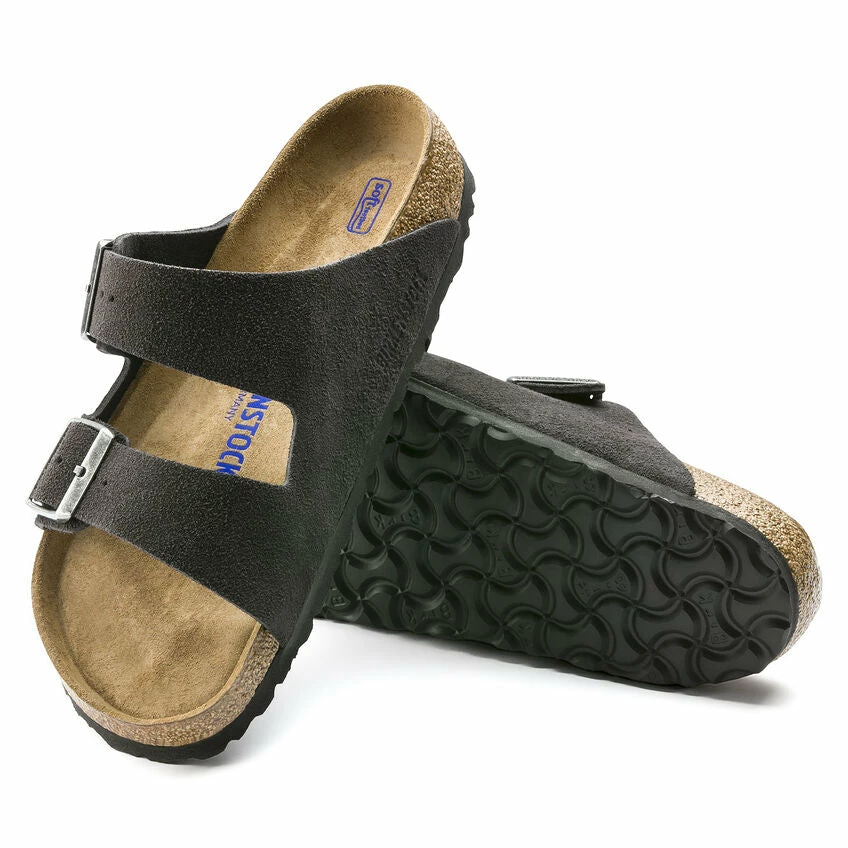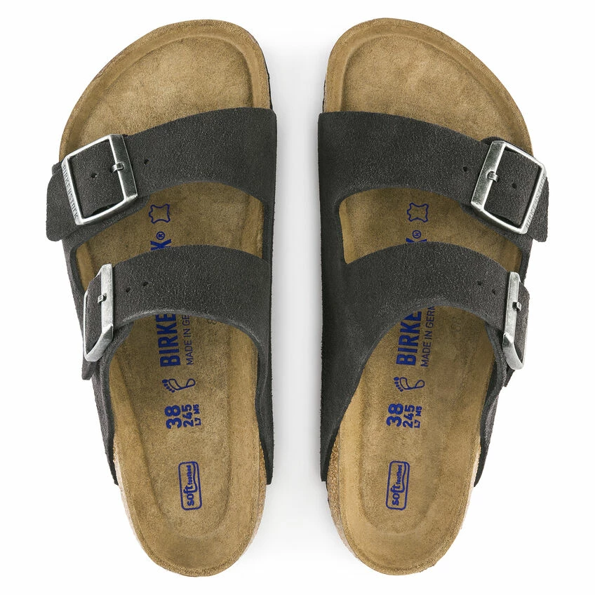 Birkenstock’s velvet grey Arizona two strap design sandal. Modeled on the cork original, suede upper and suede lined. Wear them with or with out socks.Â