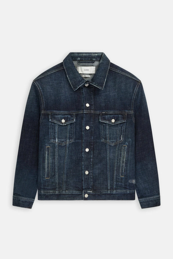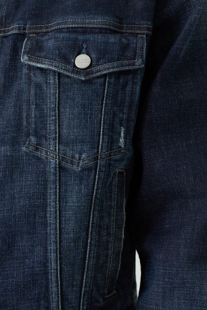 Closed dark blue 13oz. denim jacket. Denim is 99% cotton with 1% stretch. Regular vintage style fit and runs true to size. Soft feel, light stretch for movement and boxer fit in dark wash with slight repairs.