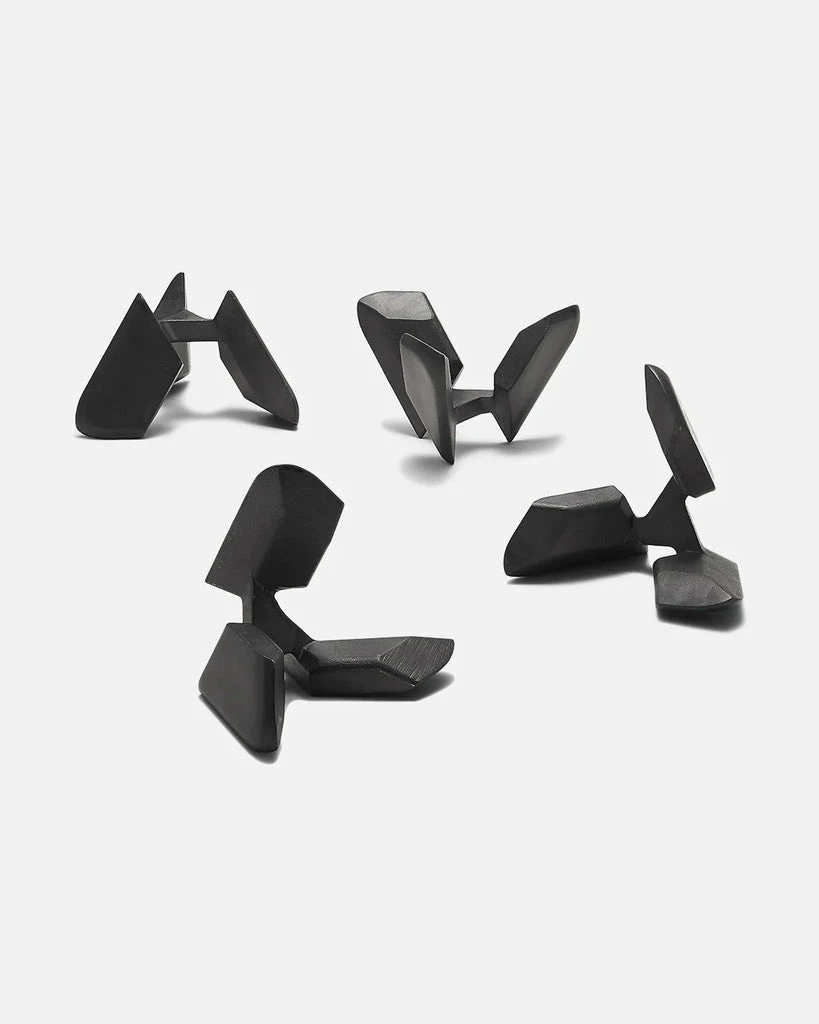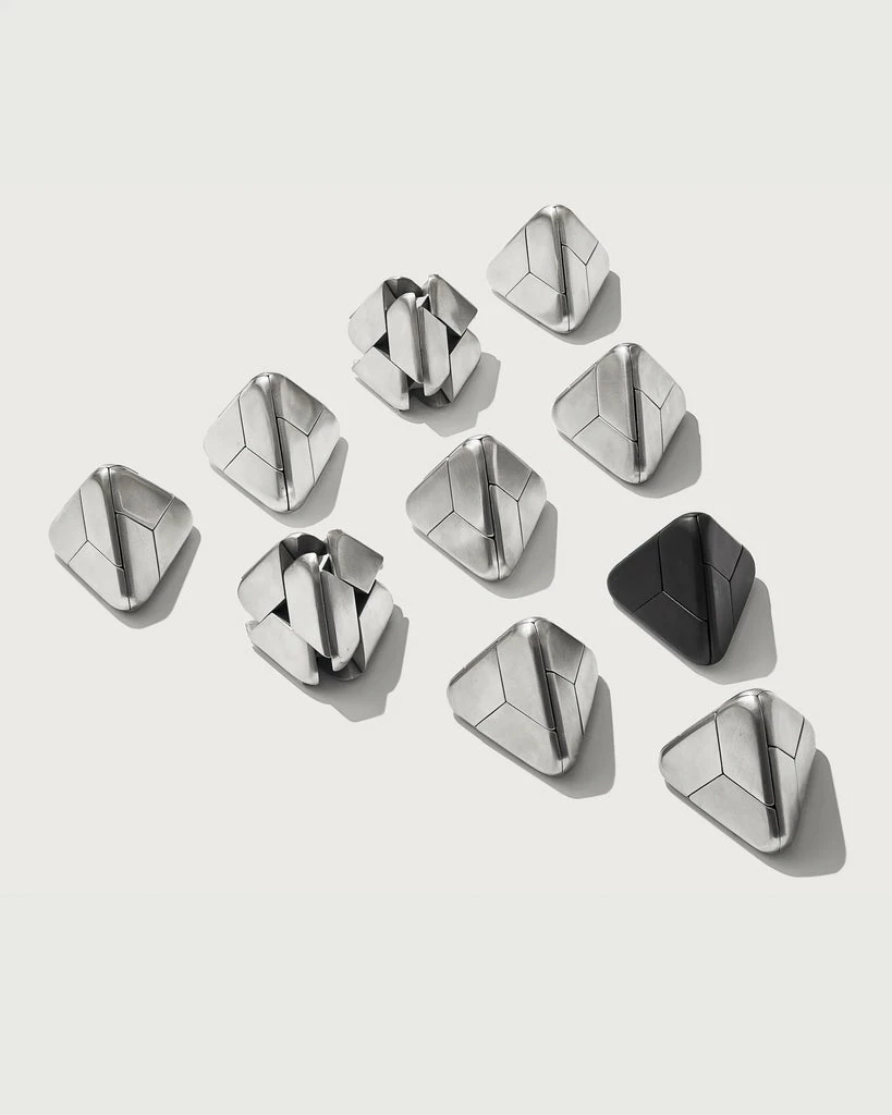 Craighill’s Tetra Puzzle is a mechanical puzzle composed of four identical pieces of oxidized stainless steel. Vapor black coating is durable and scratch resistant