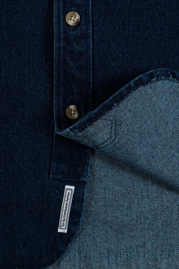 Cuisse de Grenouille blue denim shacket (shirt jacket!) Heavy cotton twill over shirt with Oeko tex button placket and cuffs. Two chest pockets with button closure. Casual fit, a little on the short side. Designed in Paris, made in Portugal.