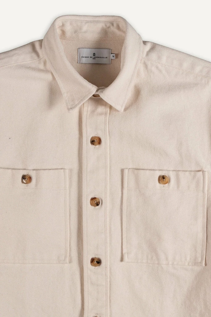 Cuisse de Grenouille ecru off white shacket (shirt jacket!) Heavy cotton over shirt with Oeko tex button placket and cuffs. Two chest pockets with button closure. Casual fit, a little on the short side. Designed in Paris, made in Portugal.