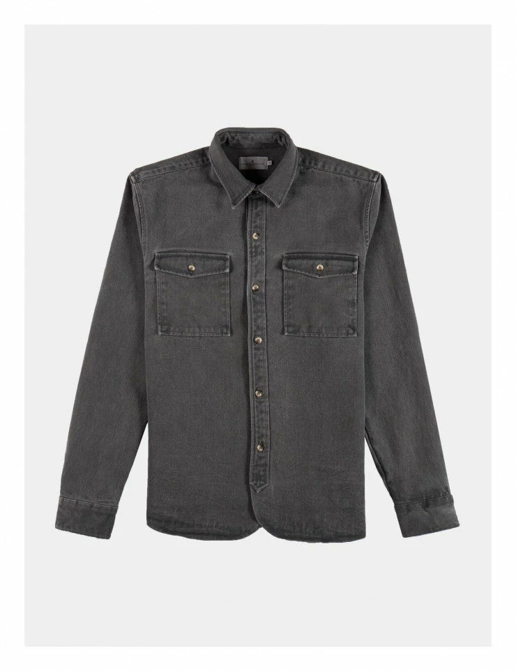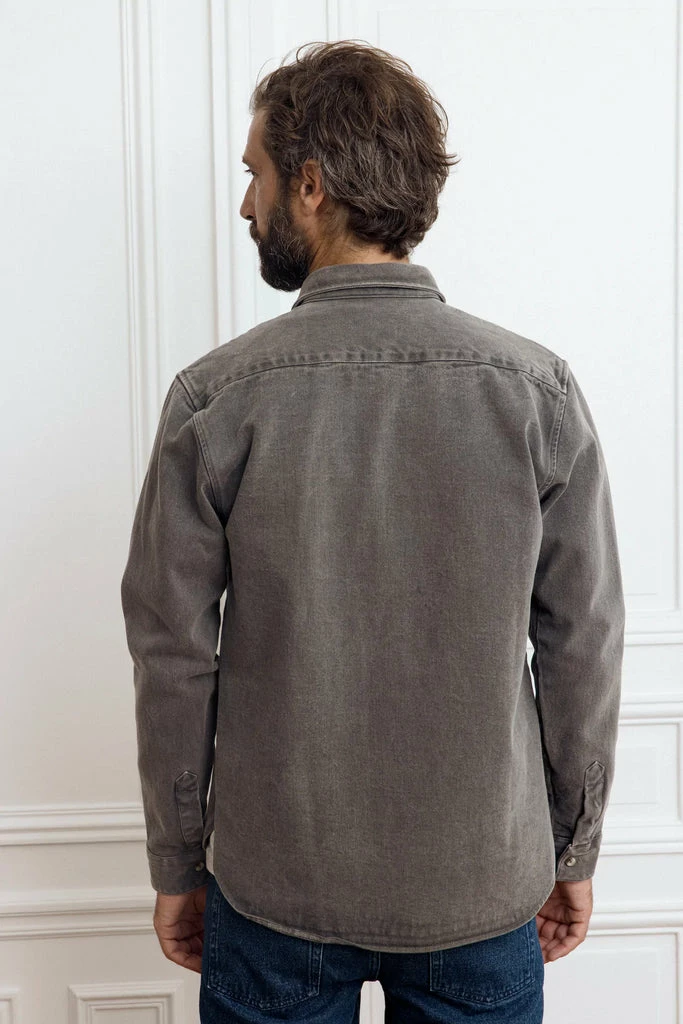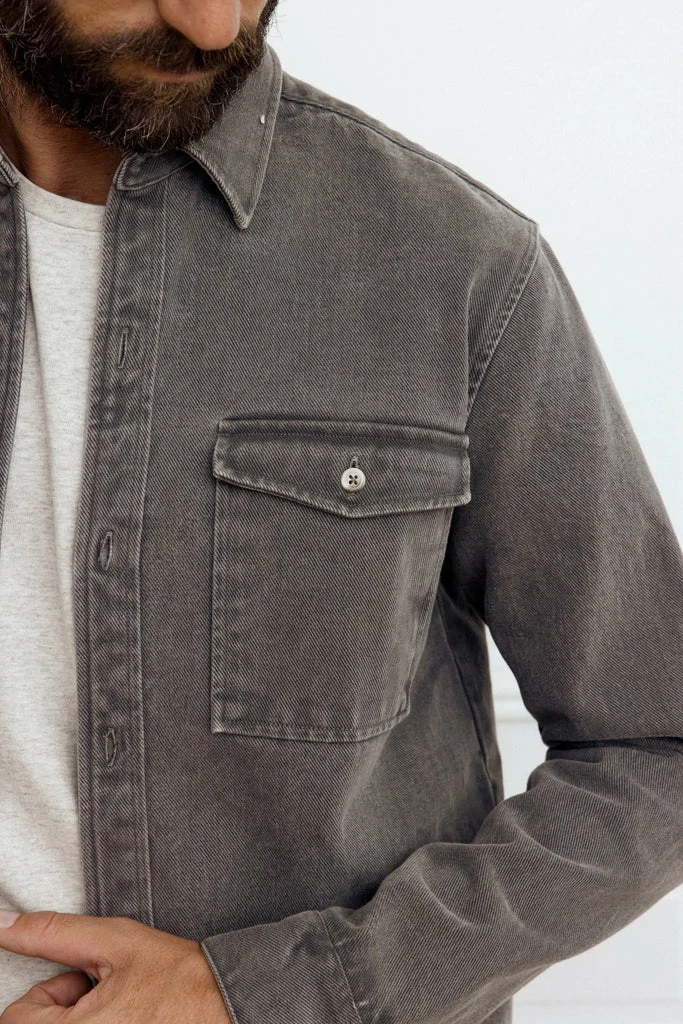 Cuisse de Grenouille charcoal grey shacket (shirt jacket!) Heavy cotton over shirt with Oeko tex button placket and cuffs. Two chest pockets with flap and button closure. Casual fit, a little on the short side. Designed in Paris, made in Portugal.
