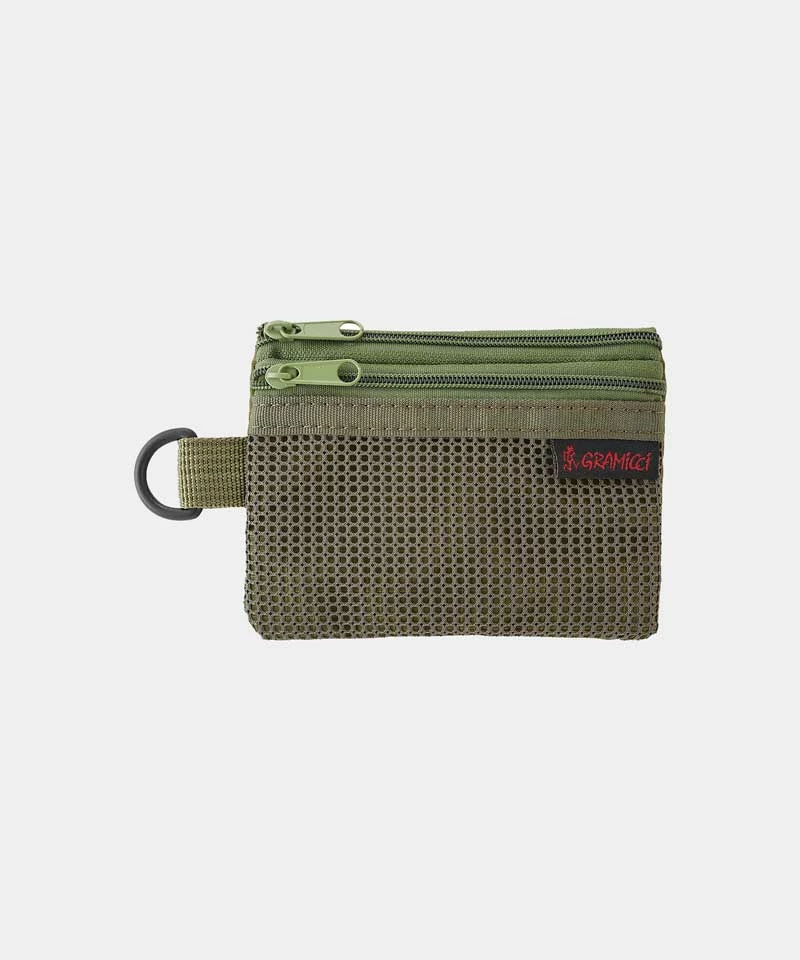 Gramicci army green ripstop wallet. Two zipper compartments. Mesh outer layer. Use a carabiner to hook to a belt loop or inside a bag to secure. Made in China.Â