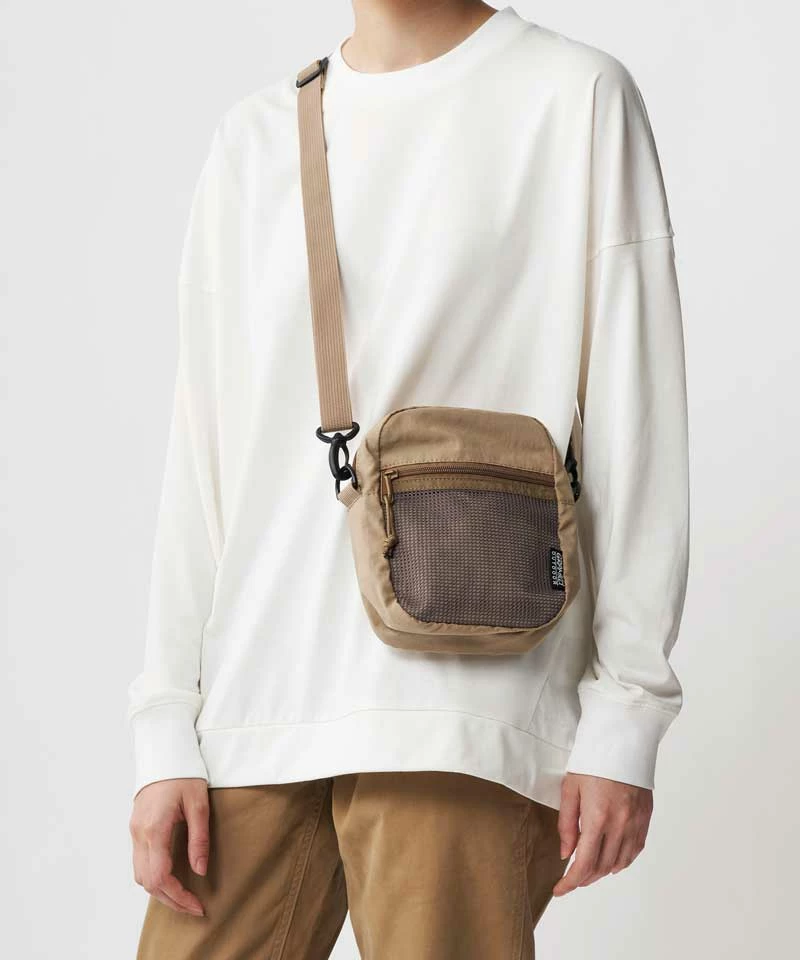Gramicci beige shoulder bag is made of 40% nylon 60% cotton fabric with a tonal adjustable strap. Measures roughly 5″ x 7″. One zipper compartments. Front pocket is mesh. Soft, lightweight and flexible.