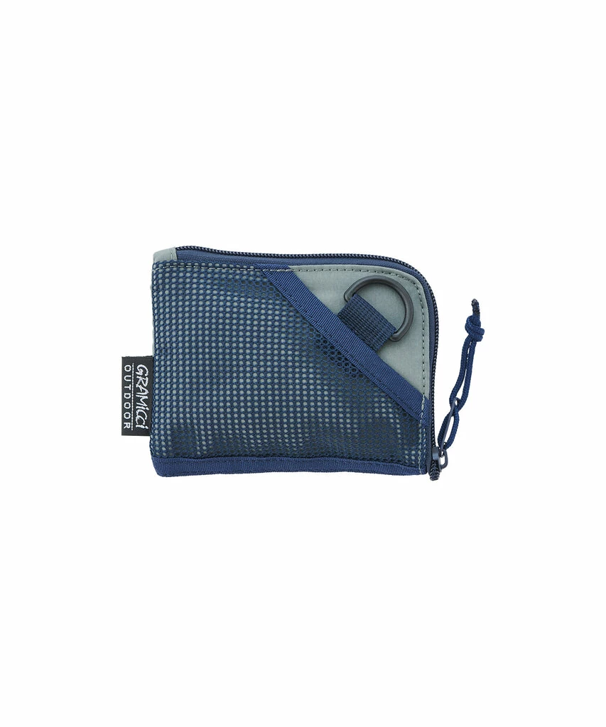 Gramicci grey cloth nylon zipper closure wallet. 60% cotton, Nylon 40% fabric. Mesh outer layer pocket. Use a carabiner to hook to a belt loop or inside a bag to secure. Made in China.Â