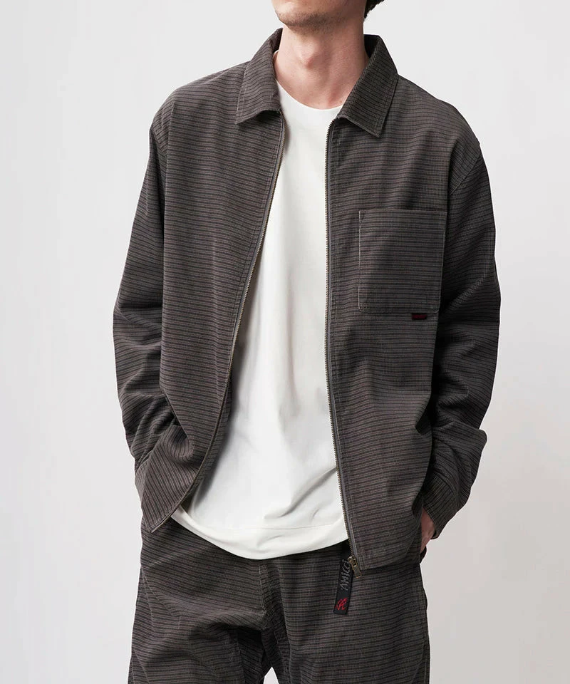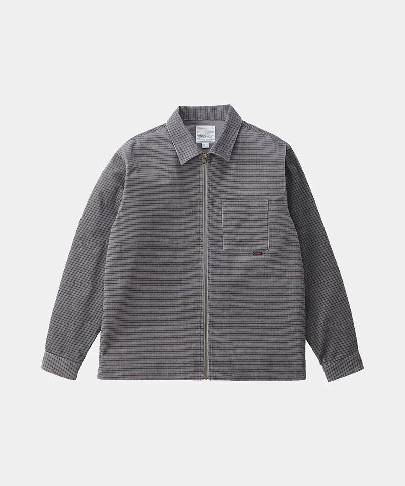 Gramicci’s grey grid corduroy zip up shirt. Original Gramicci cord 100% Cotton re issue fabric. Layered stripe print, creating a lattice-like grid appearance on fabric. Front chest patch pocket with logo, wrist length sleeves with button cuffs with full zip closure.Â
