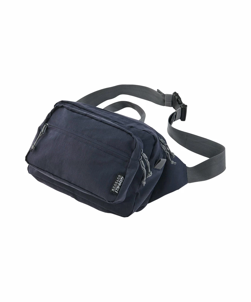 Gramicci navy blue crossbody waist bag is made of 40% nylon 60% cotton fabric with a tonal adjustable strap that has easy release buckle for removal. Measures roughly 12″ x 8″ x 4″. Three zipper seperate compartments. Front pocket is mesh. Soft, lightweight and flexible.