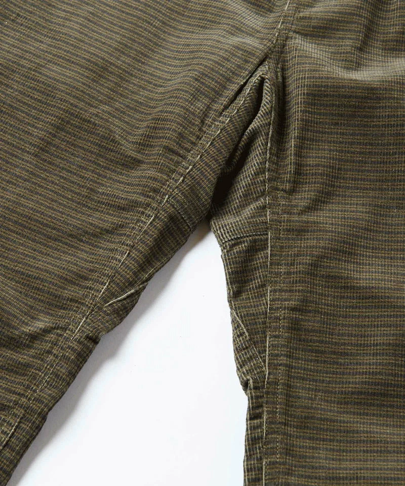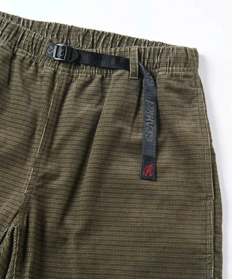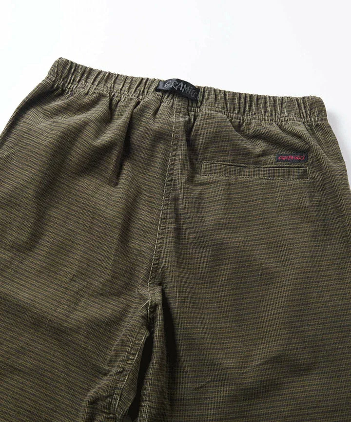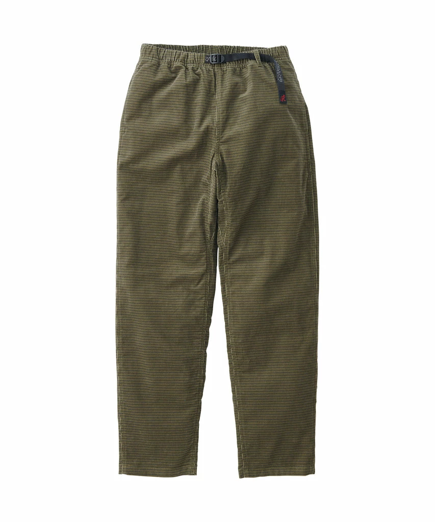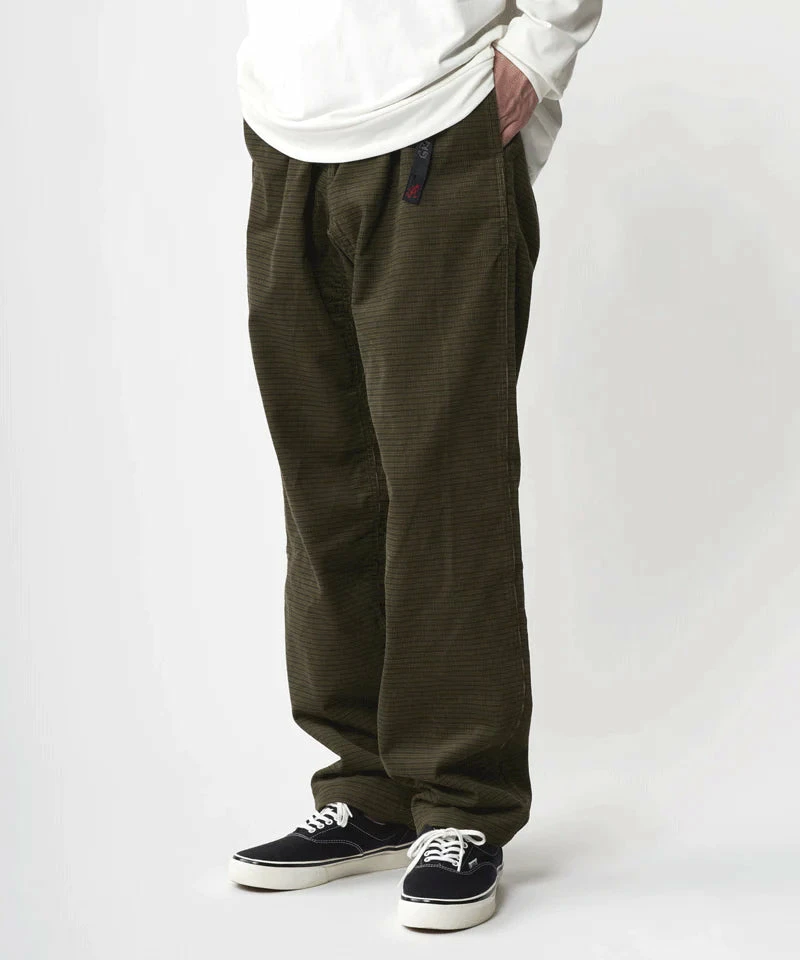 Gramicci’s olive green grid corduroy jam pant. Original Gramicci cord 100% Cotton re issue fabric. 90’s re issue style, straight wide leg. Gusset crotch for movement, flexible waistband with webbing belt and loose fit.