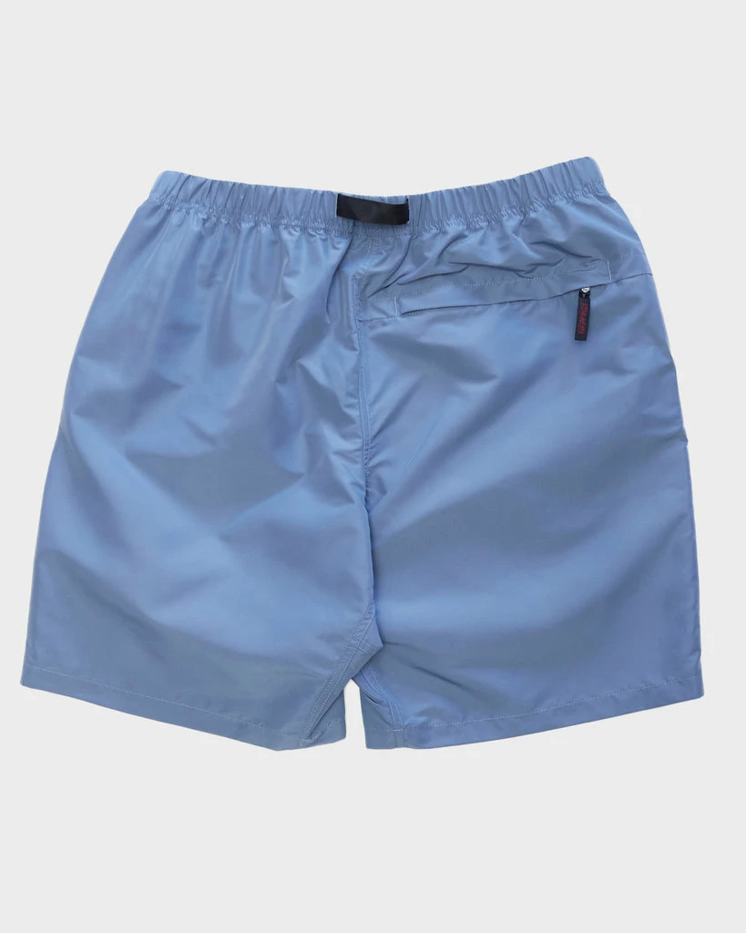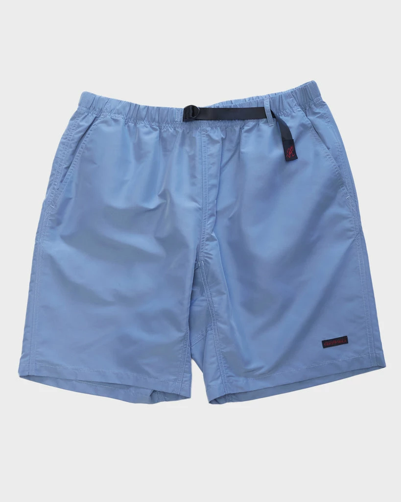 Gramicci’s smoke blue nylon shell packable shorts. Elastic and nylon web belt closure waist. Roomy fit. Above the knee length with a straight leg. The shell packable shorts can be also worn as a swim trunk.