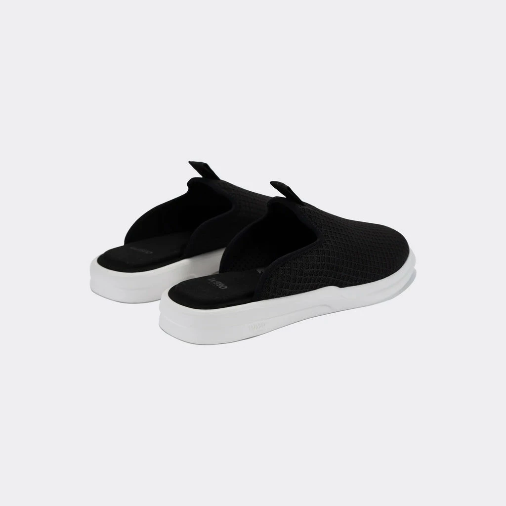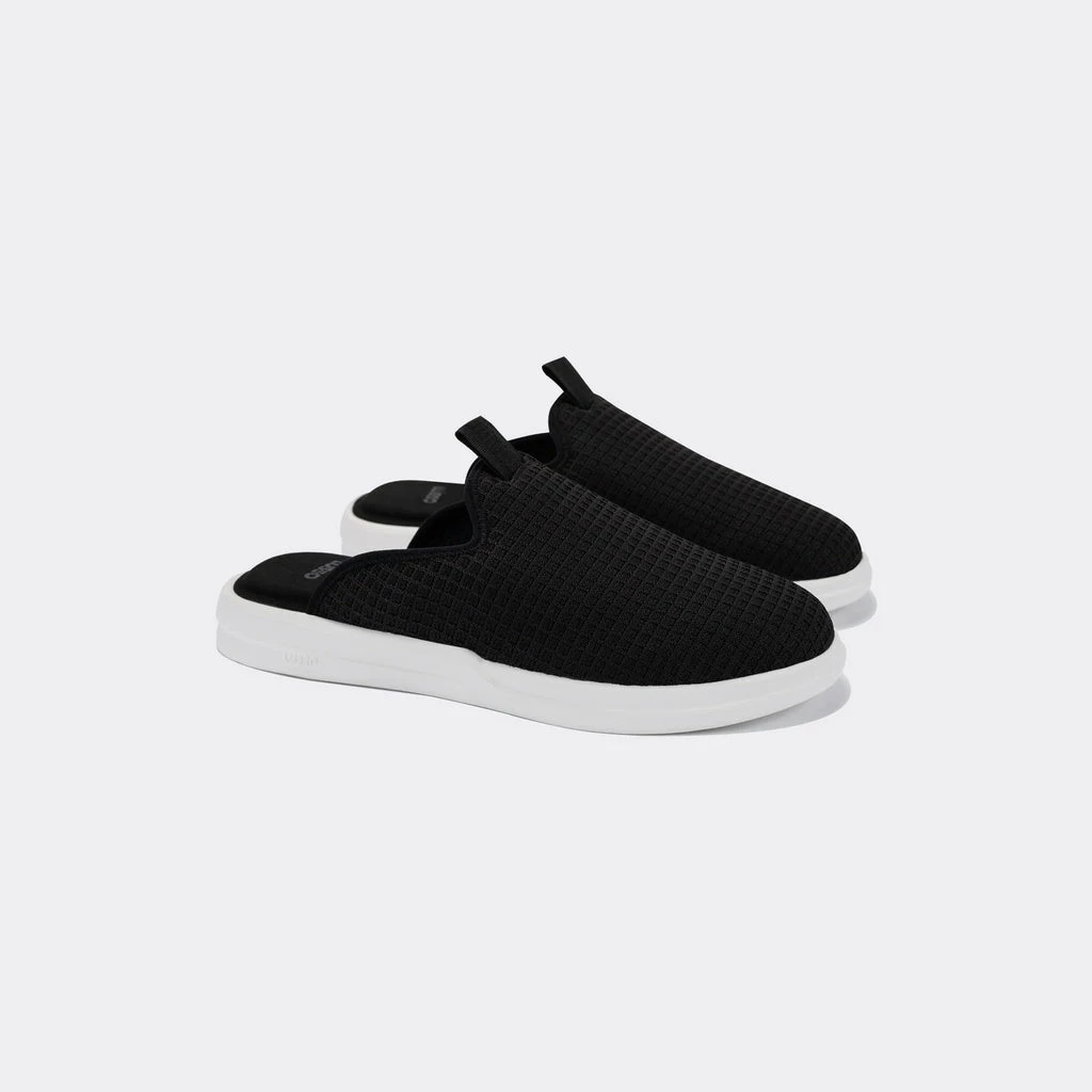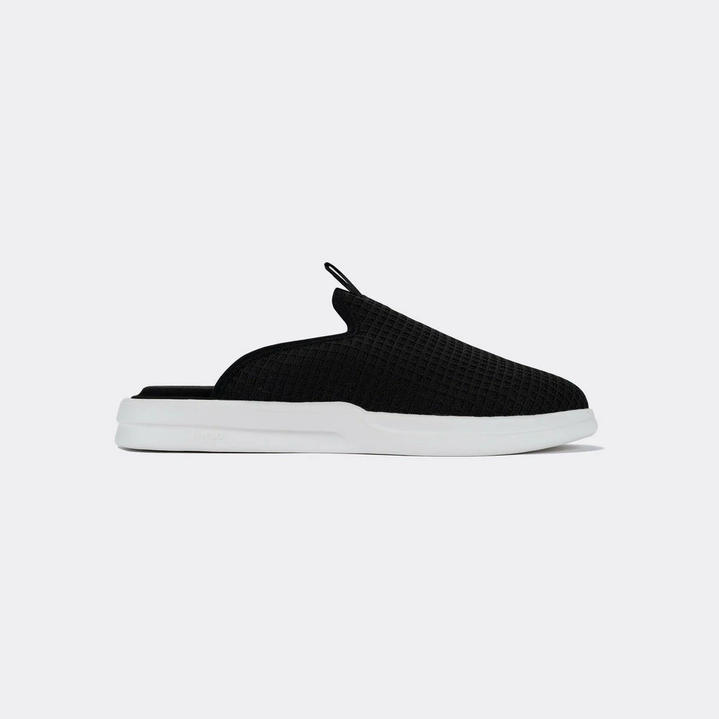 Lusso Cloud’s black and white Pelli men’s comfort slide. Featuring engineered waffle knit upper, made from partially recycled bamboo, and a jacquard cross-hatch grosgrain pull tab.
