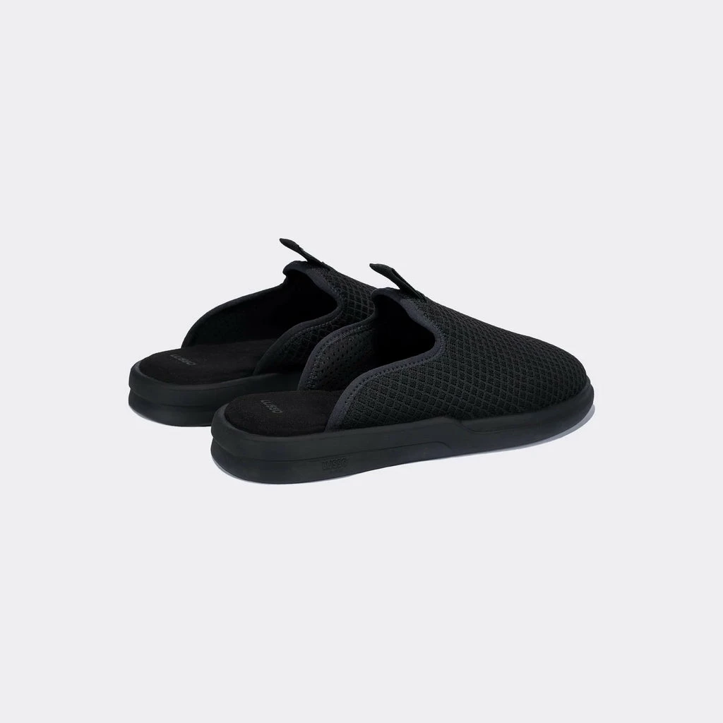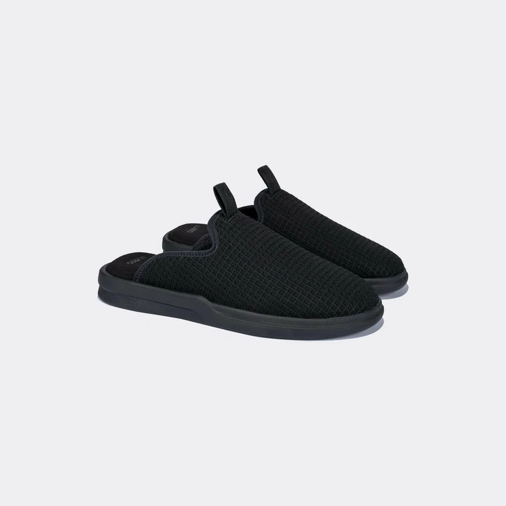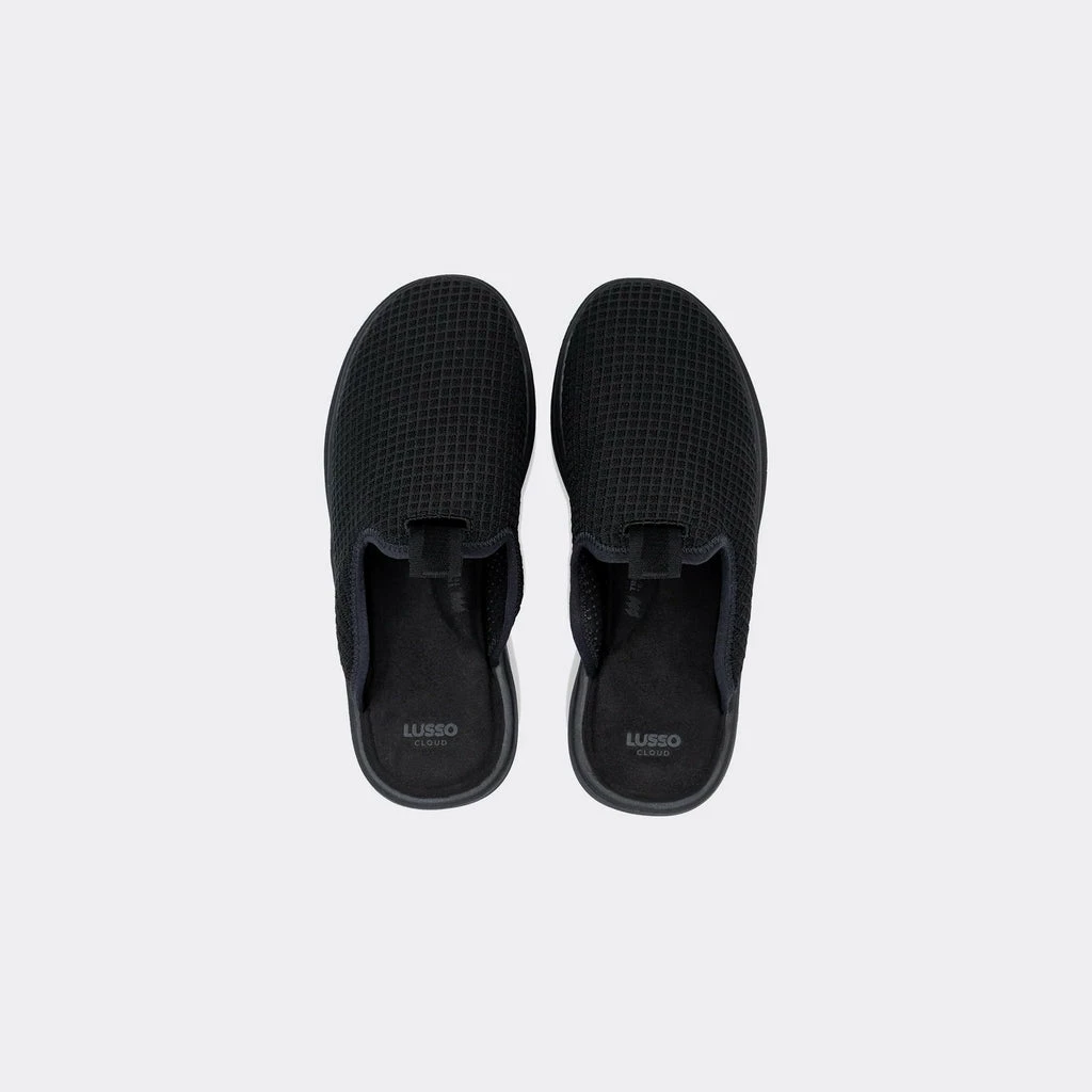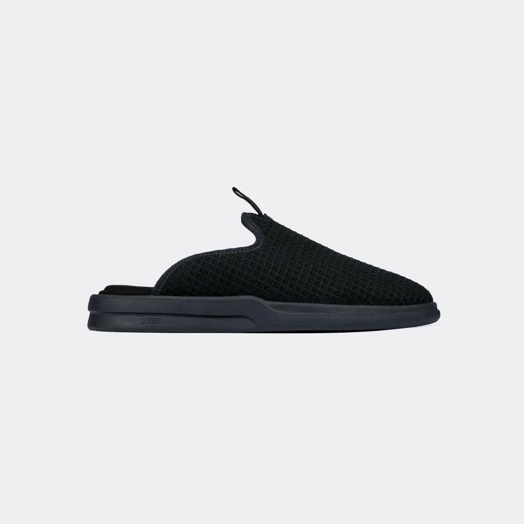 Lusso Cloud’s jet black and black Pelli men’s comfort slide. Featuring engineered waffle knit upper, made from partially recycled bamboo, and a jacquard cross-hatch grosgrain pull tab.