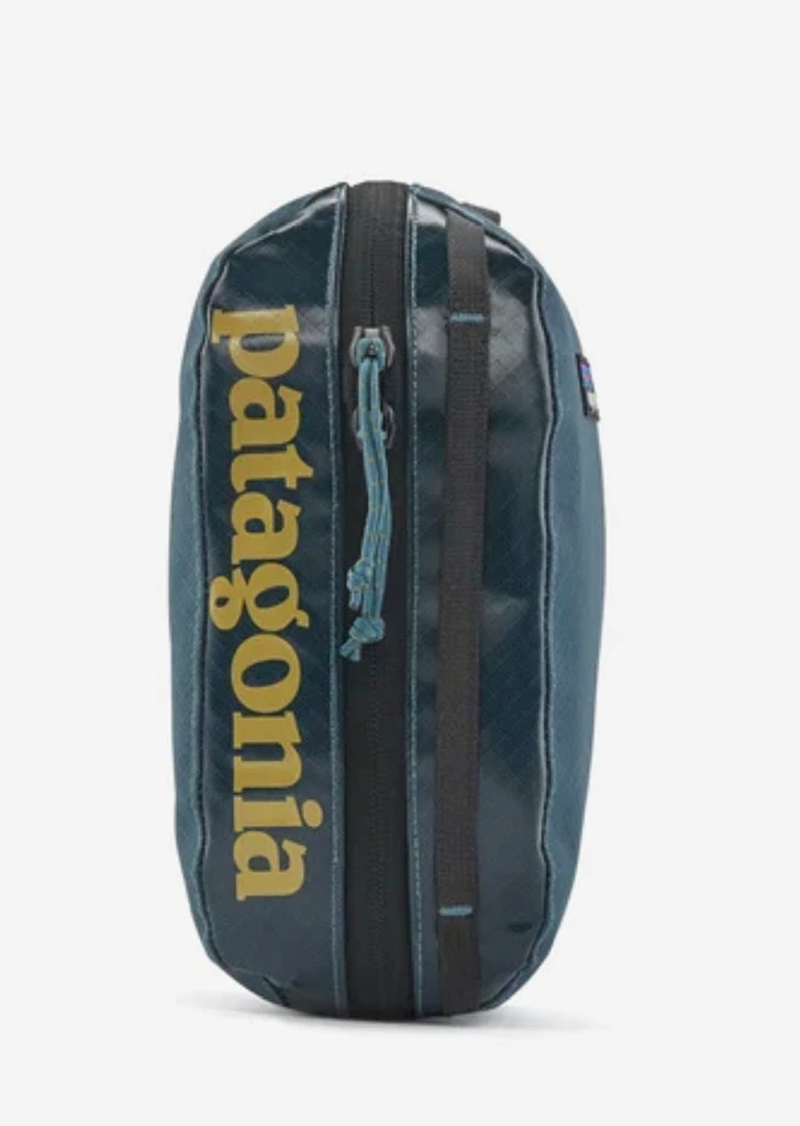 Patagonia Abalone Blue Small Black Hole Cube is a Dopp kit or small organizer. Â Made of lightweight 100% recycled polyester fabric and 100% recycled polyester lining. Â It is weather resistant and has a single compartment with interior organization.
