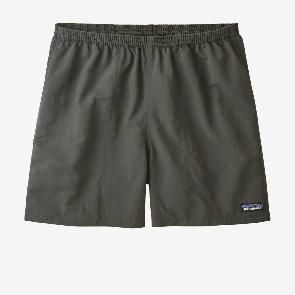 Patagonia’s forge grey lightweight and durable 100% recycled polyester ripstop fabric shorts with a DWR (durable water repellent) finish. 5″ inseam.