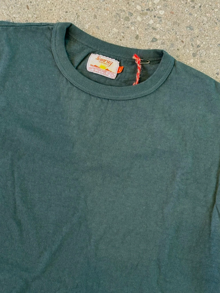 Sunray Haleiwa tee in dark spruce. Recycled heavyweight cotton. Traditional 1950’s fit, slightly boxy, slightly more generous short sleeve. Tube tee with no side seams. Fits true to size. All packaging and tags from recycled materials.