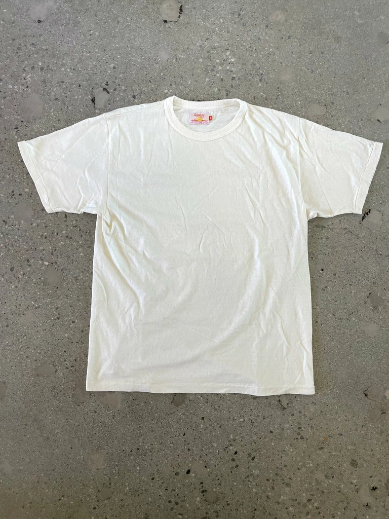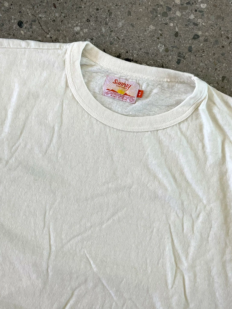 Sunray Haleiwa tee in off white with a very slight pale yellow tone. Recycled heavyweight cotton. Traditional 1950’s fit, slightly boxy, slightly more generous short sleeve. Tube tee with no side seams. Fits true to size. All packaging and tags from recycled materials.