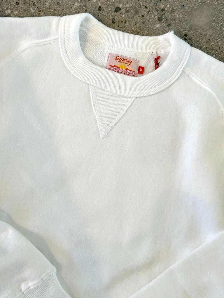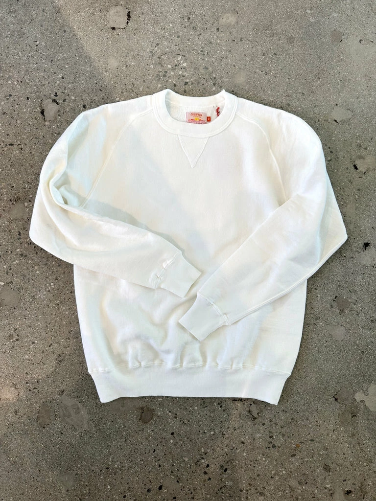 Sunray Puamana raglan crewneck sweatshirt in off white. Recycled heavyweight cotton. Traditional 1950’s fit. Fits true to size. All packaging and tags from recycled materials.