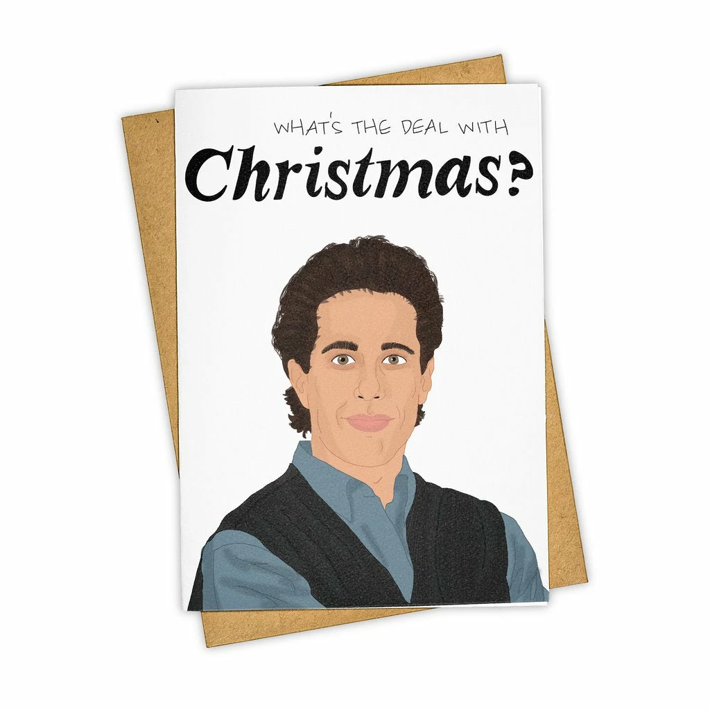 WHAT’S THE DEAL WITH CHRISTMAS holiday greeting card inspired by Seinfeld. (5 in. x 7 in.) Blank inside. Enclosed in a kraft envelope. Printed on recycled stock in the USA. Â