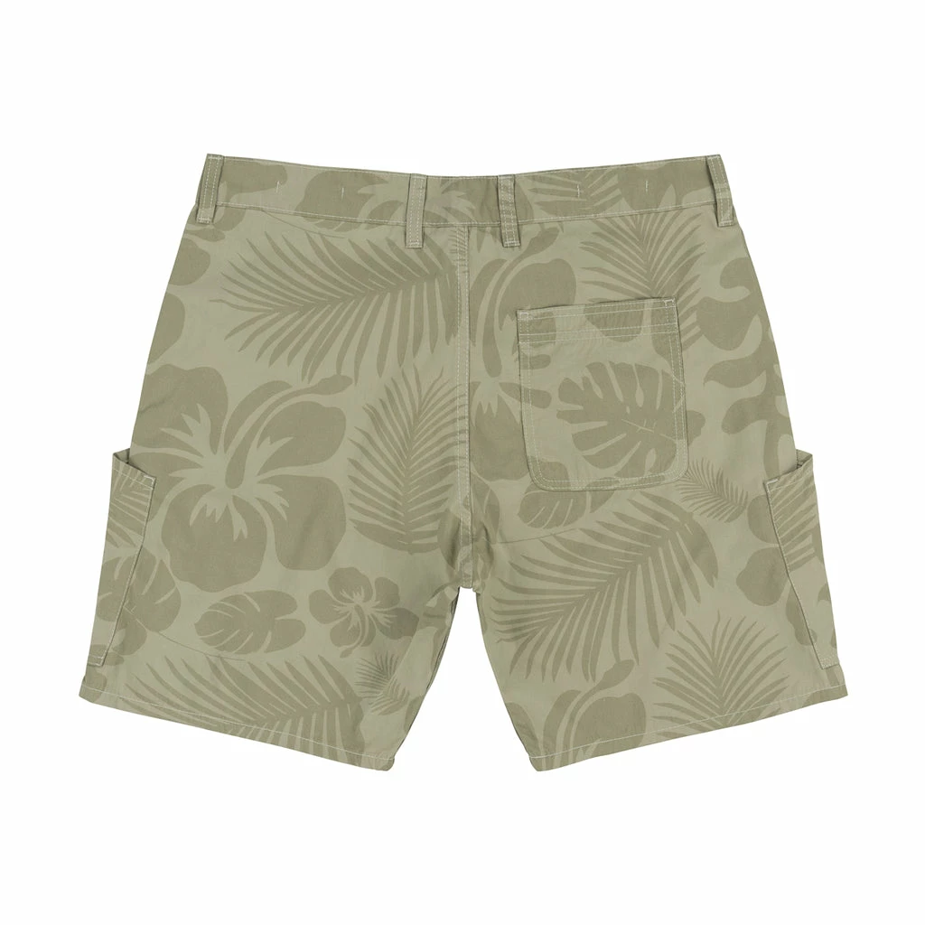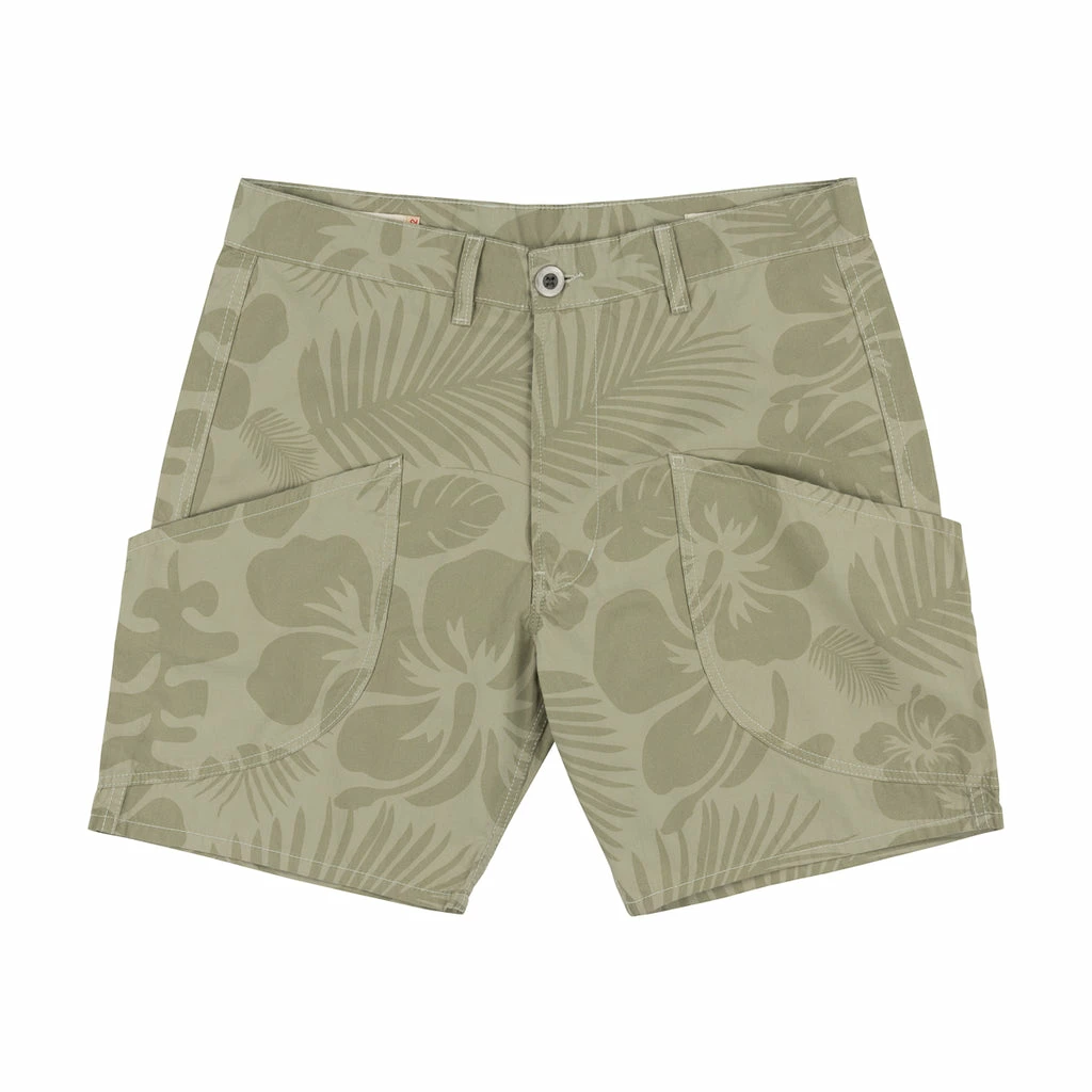 TSPTR green aloha floral print Zuma shorts. Modified 1960’s beach short with deep asymmetric wrap around pockets, relaxed fit with tapered leg, button waist closure, constructed from 5 1/2 oz Portuguese cotton poplin which is densely woven cotton is super lightweight and naturally wind resistant. Overdyed using natural Dye.Â