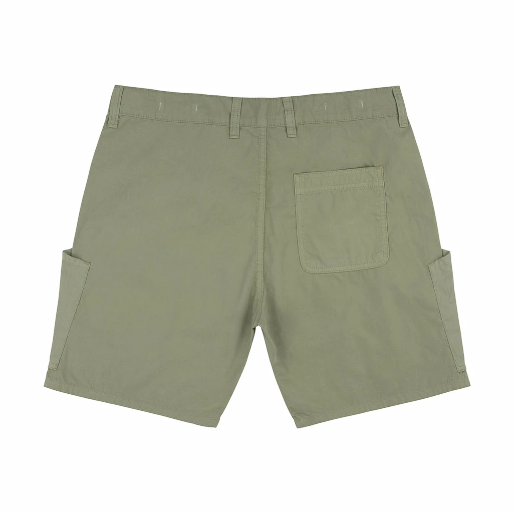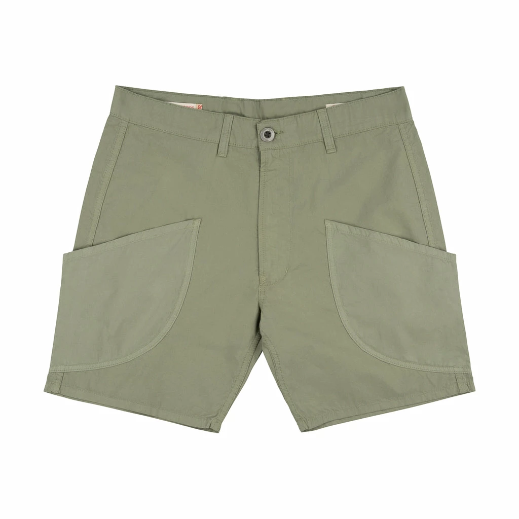 TSPTR olive green Zuma shorts. Modified 1960’s beach short with deep asymmetric wrap around pockets, relaxed fit with tapered leg, button waist closure, constructed from 5 1/2 oz Portuguese cotton poplin which is densely woven cotton is super lightweight and naturally wind resistant. Overdyed using natural Dye.Â
