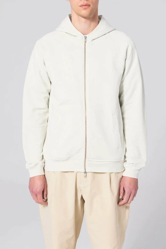 Unfeigned bone white color fitted zip up hooded sweatshirt. 100% Organic cotton french terry fabric, two way zipper closure, pullover hood, side slash pockets, raglan sleeve, ribbed cuffs and seam centered detail on arms. Straight hem with slash sides for movement. Made in PortugalÂ