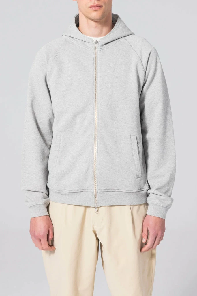 Unfeigned heather grey color fitted zip up hooded sweatshirt. 100% Organic cotton french terry fabric, two way zipper closure, pullover hood, side slash pockets, raglan sleeve, ribbed cuffs and seam centered detail on arms. Straight hem with slash sides for movement. Made in Portugal