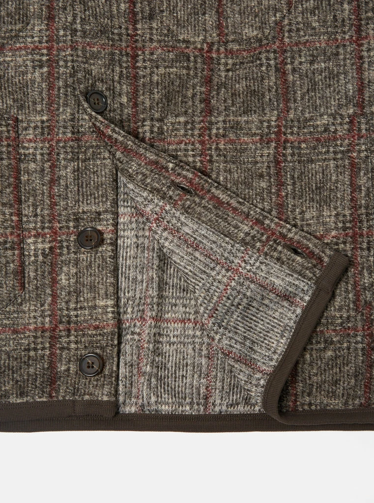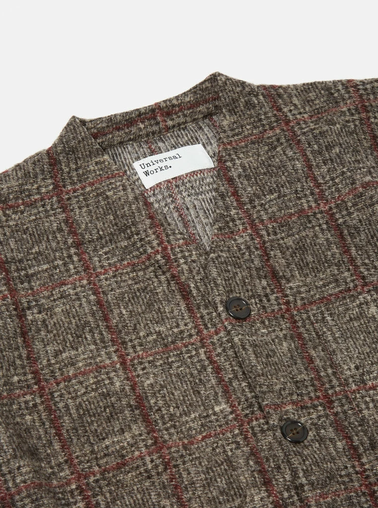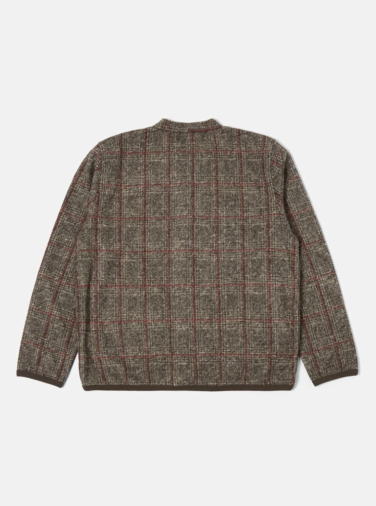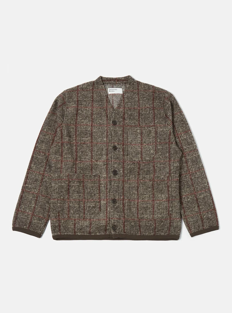 Universal Works brown Bari fleece cardigan. Fabric content 40% wool, 39% polyester and 21% acrylic. Curved V Neck collar, five button front, single patch chest pocket, two patch pockets and bound soft cotton rib trim.