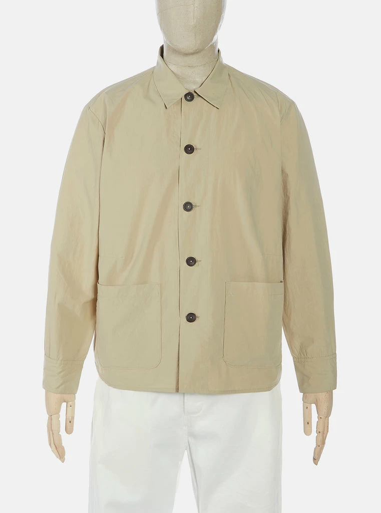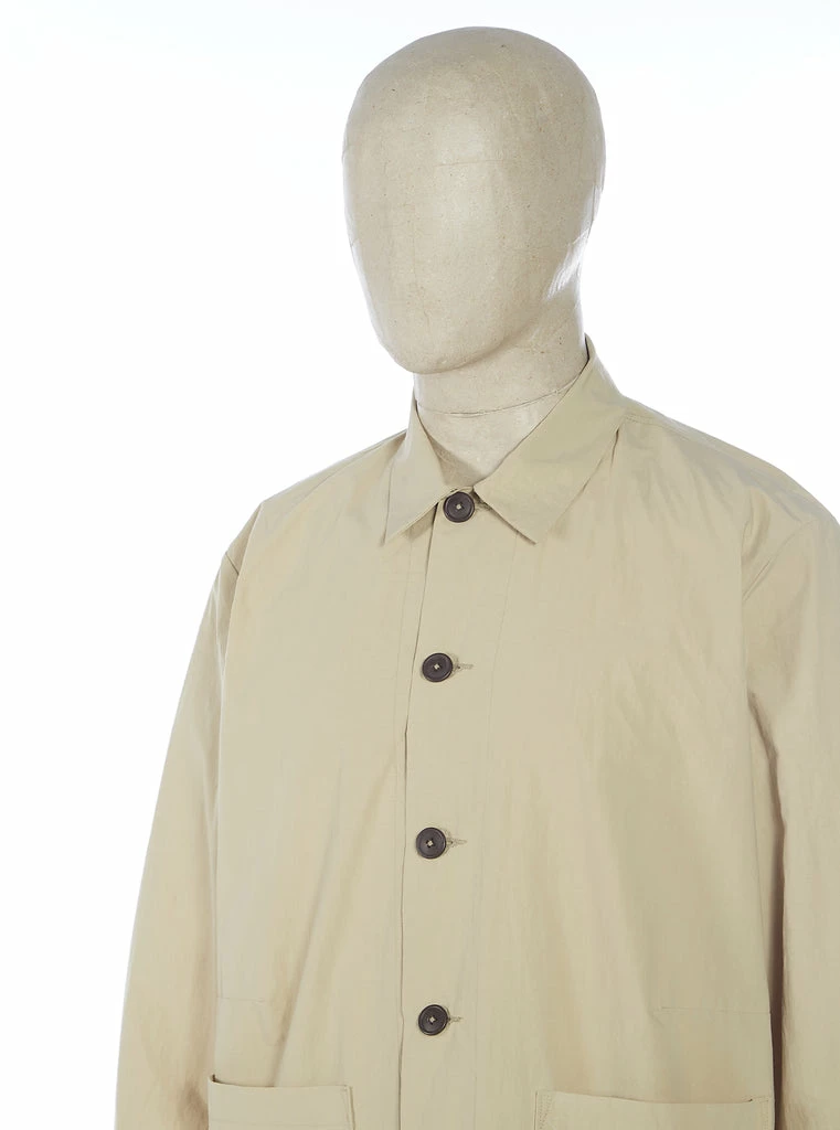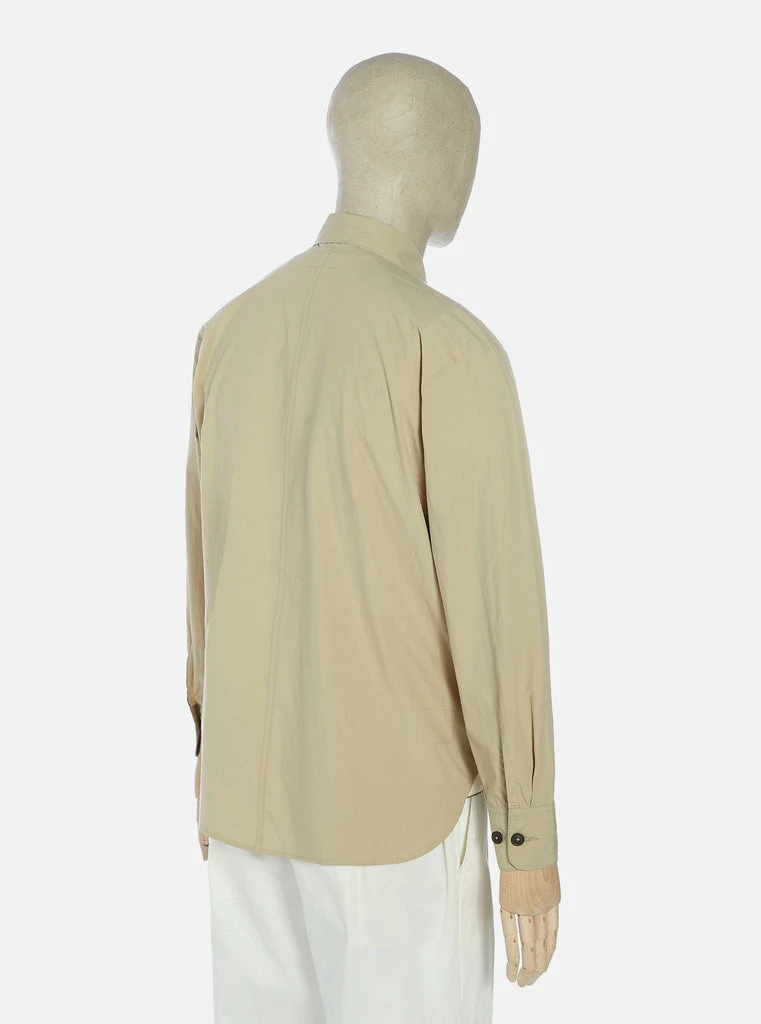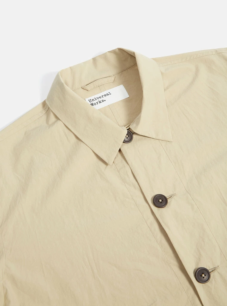 Universal Works sand long sleeve button down Travail shirt jacket. 100% cotton fine woven Japanese fabric, super lightweight and breathable. Oversized jacket like fit, button cuffs, lower two patch pockets, curved hem with contrast V insert for movement with tonal buttons.