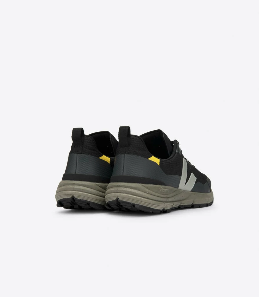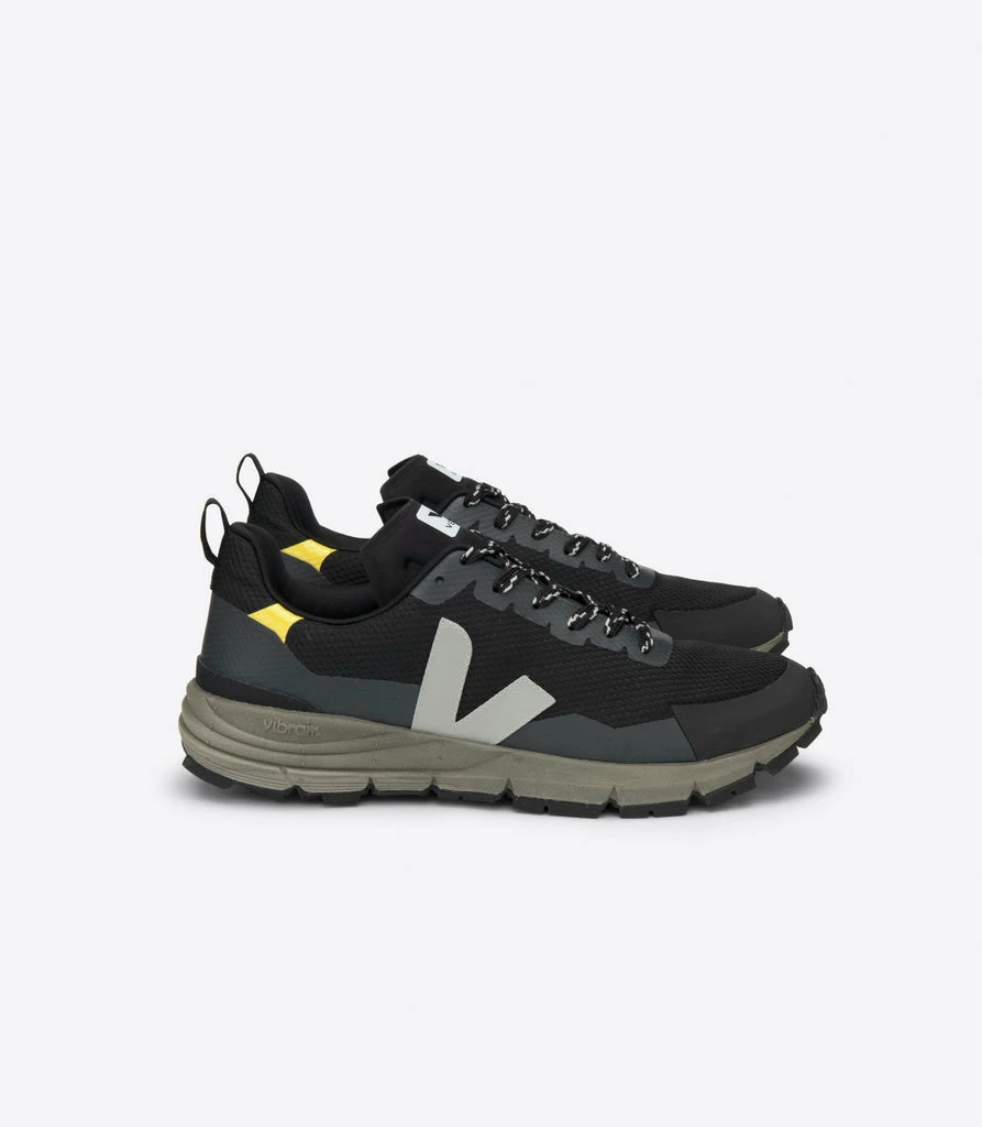 Men’s VEJA x Vibram Dekkan in black oxford grey tonic sole walking hiking sneaker. Dekkan is inspired by the outdoor world and can be worn for waling or hiking. There is a Waterproof perimeter of the sole. The Alveomesh is a technical fabric made out exclusively of recycled polyester. It brings breathability, flexibility and lightness to the shoe. Made in Brazil.