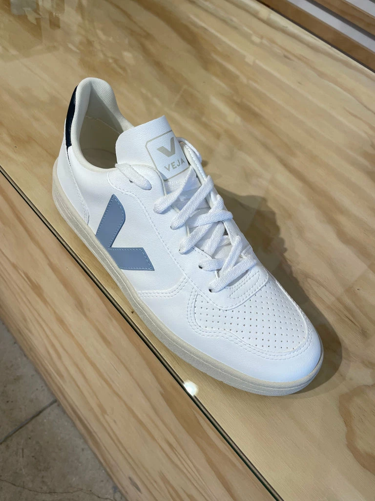 Men’s VEJA V-10 steel grey and white nautico sneakers. Steel grey “V” on side and black heel. Launched in 2011, this style is named after the Brazilian NGO, which brings technical support to the organic cotton farming families that Veja works with in North Brazil since 2004. 100% CWL vegan upper. Insole made of recycled cotton & rubber. Outsole made of wild rubber from the Amazon. Made in Brazil.