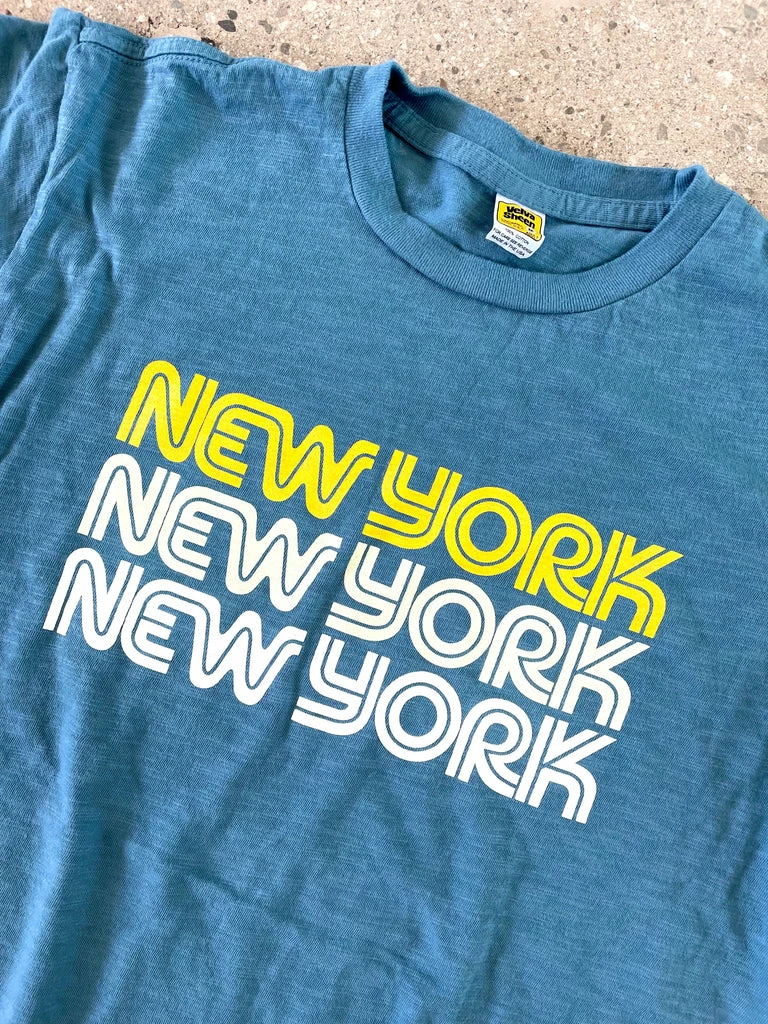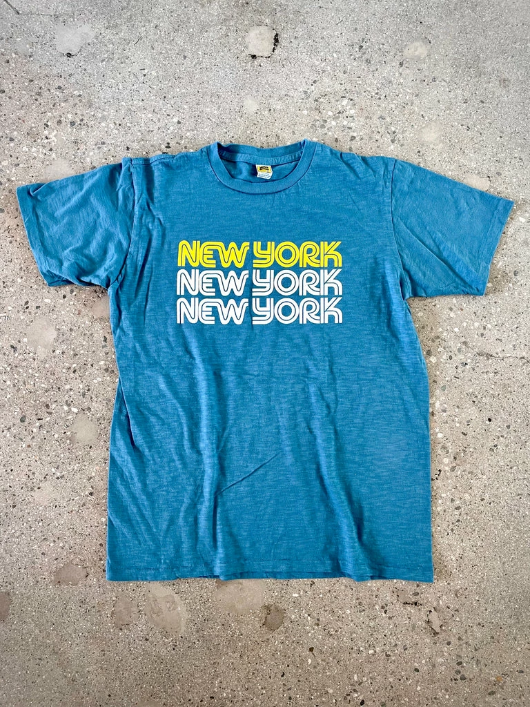 Velva Sheen New York graphic tee. Classic slub cotton “rolled” tube tee in azure blue with yellow and white NEW YORK repeating graphic on chest. Rolled tees are based on a 1970’s original and run small. We recommend sizing up one size from what you normally wear. Made in USA. Limited quantities available.