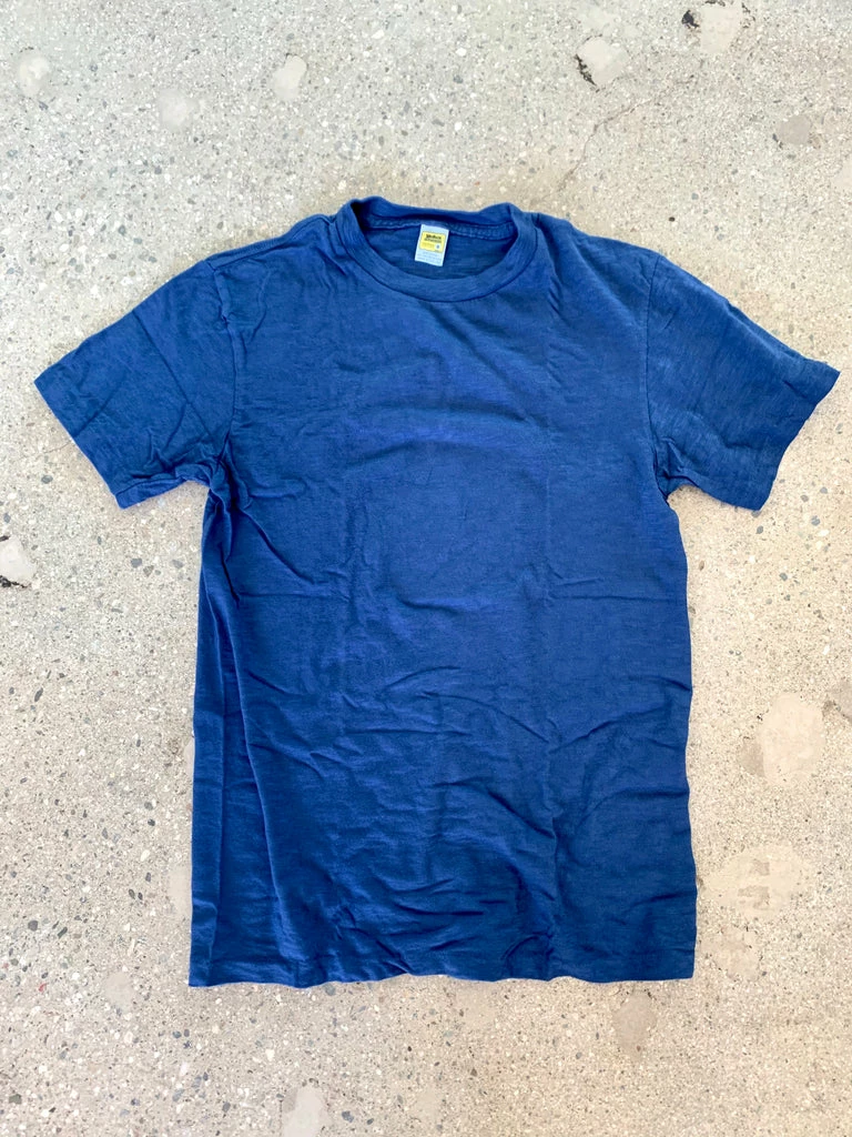 Velva Sheen blue rolled t-shirt. 100% cotton slub tee with a a soft, vintage feel. No side seams as the garment is made in a circular machine. Runs small, please size up one size. Available in sizes Small – X-Large. Made in California.