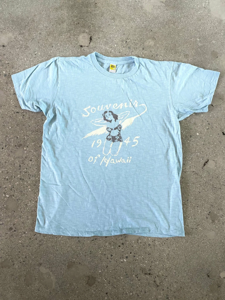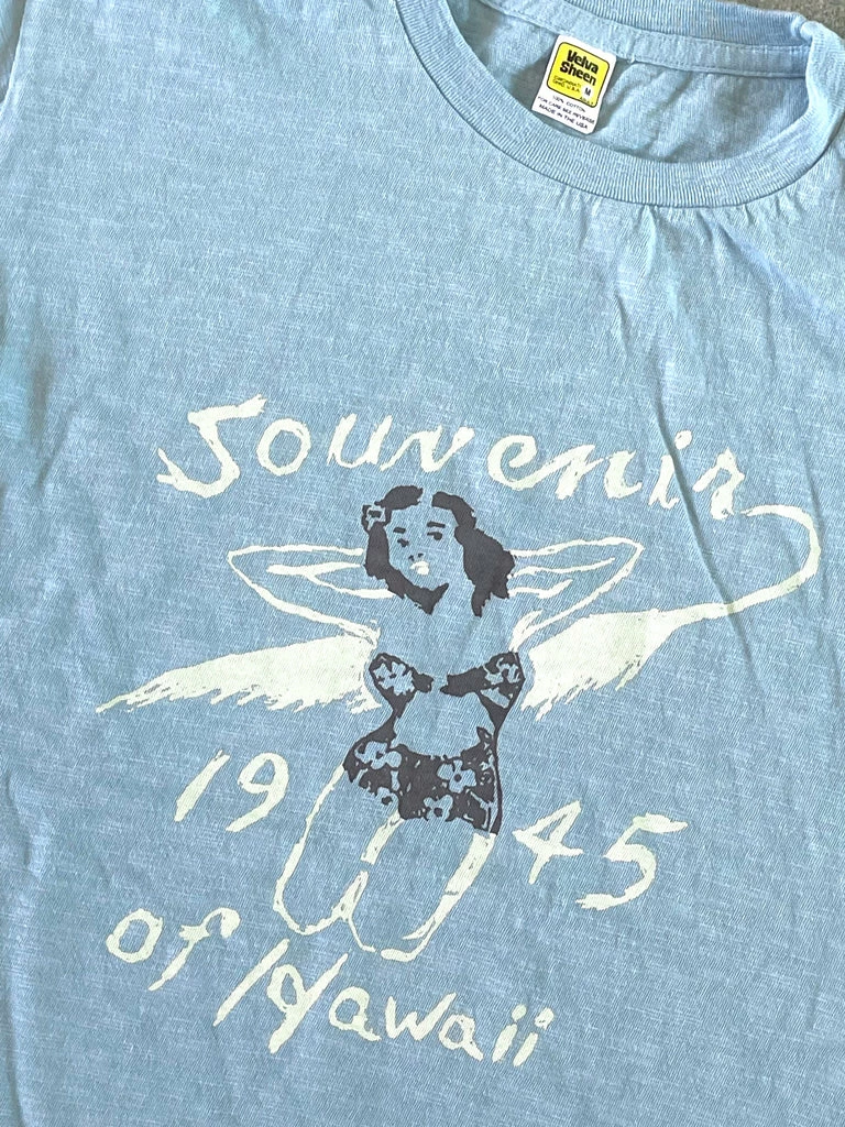 Velva Sheen Hawaii Souvenier graphic tee. Classic slub cotton “rolled” tube tee in a frost blue color with retro graphic on chest. Rolled tees are based on a 1970’s original and run small. We recommend sizing up one size from what you normally wear. Made in USA. Limited quantities available.