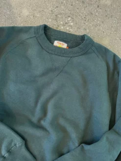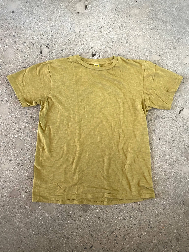 Velva Sheen moss green rolled t-shirt. 100% cotton slub tee with a a soft, vintage feel, recreated from the late 70’s original. Tube tee with no side seams, made on a circular loom. Runs small but is casual fitting in the body. We recommend sizing up one size.