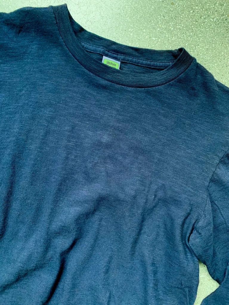 Velva Sheen Navy Regular Long Sleeve T-shirt.  No side seams as the garment is made in a circular machine. Tees fit small, we recommend you size up one.