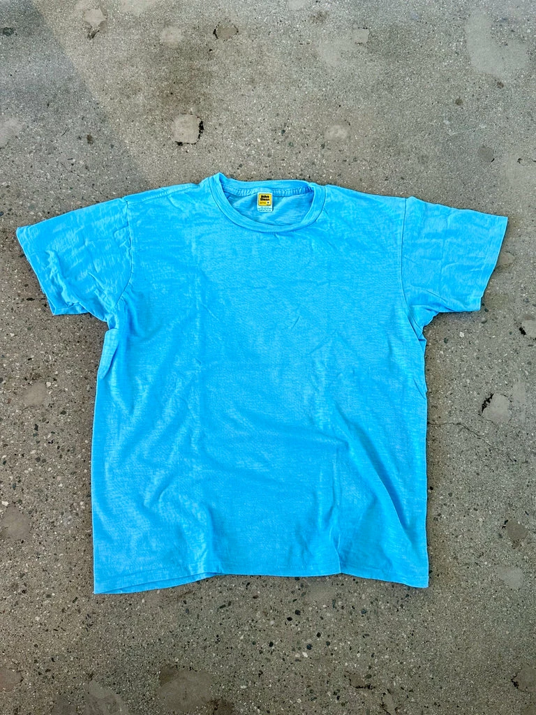 Velva Sheen rain bright blue rolled t-shirt. 100% cotton slub tee with a a soft, vintage feel, recreated from the late 70’s original. Tube tee with no side seams, made on a circular loom. Runs small but is casual fitting in the body. We recommend sizing up one size.