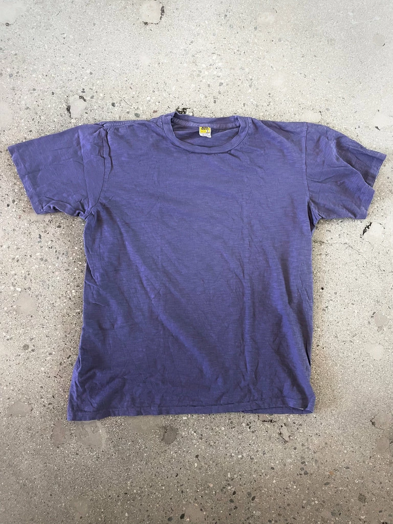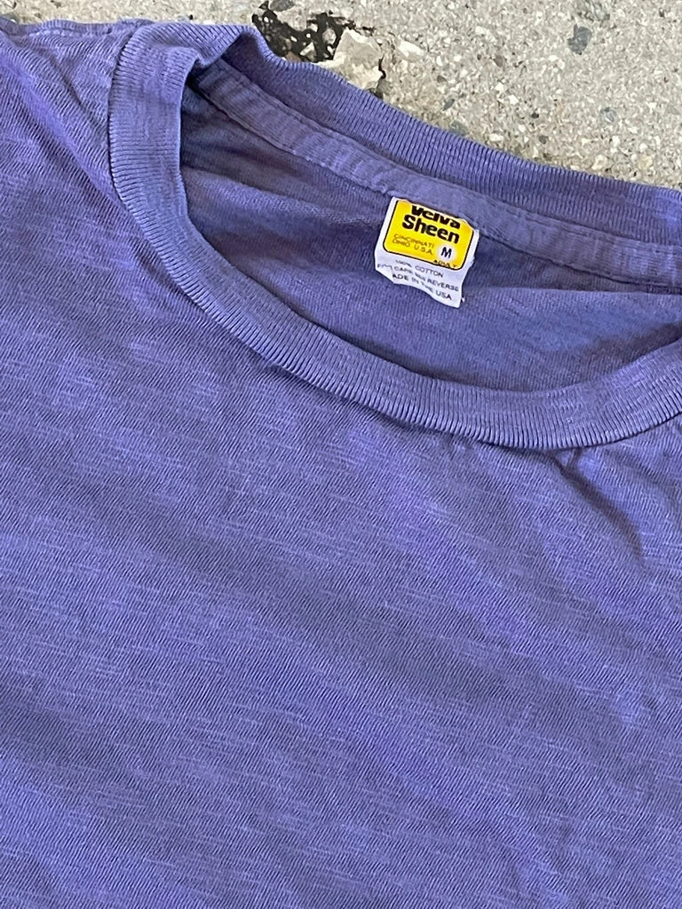 Velva Sheen royal purple rolled t-shirt. 100% cotton slub tee with a a soft, vintage feel, recreated from the late 70’s original. Tube tee with no side seams, made on a circular loom. Runs small but is casual fitting in the body. We recommend sizing up one size.