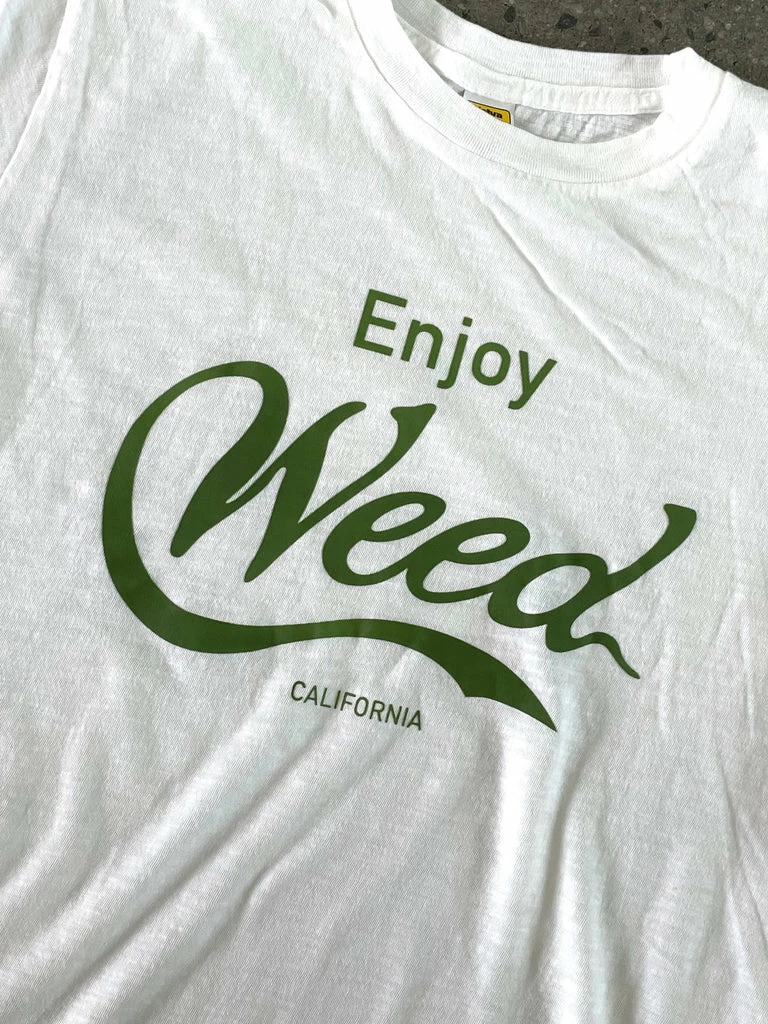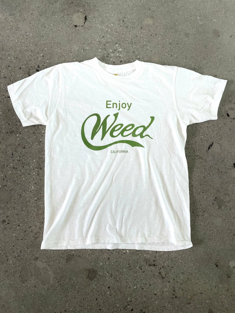 Velva Sheen Enjoy Weed California graphic tee. Classic slub cotton “rolled” tube tee in a white with retro graphic on chest. Rolled tees are based on a 1970’s original and run small. We recommend sizing up one size from what you normally wear. Made in USA. Limited quantities available.