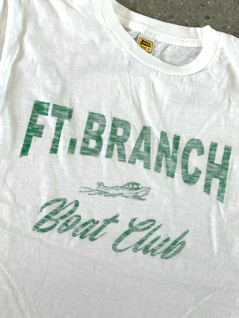 Velva Sheen Ft Branch Boat Club graphic tee. Classic slub cotton “rolled” tube tee in white with retro graphic on chest. Rolled tees are based on a 1970’s original and run small. We recommend sizing up one size from what you normally wear. Made in USA. Limited quantities available.